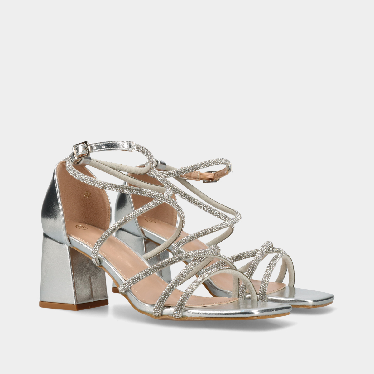 Sandálias prateadas de festa, com salto médio largo e fivela ajustável. Confortáveis e elegantes, ideais para casamentos, festas e ocasiões especiais.