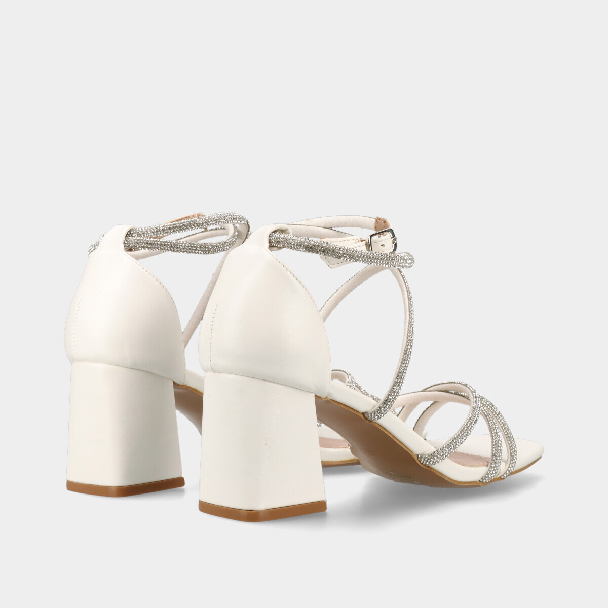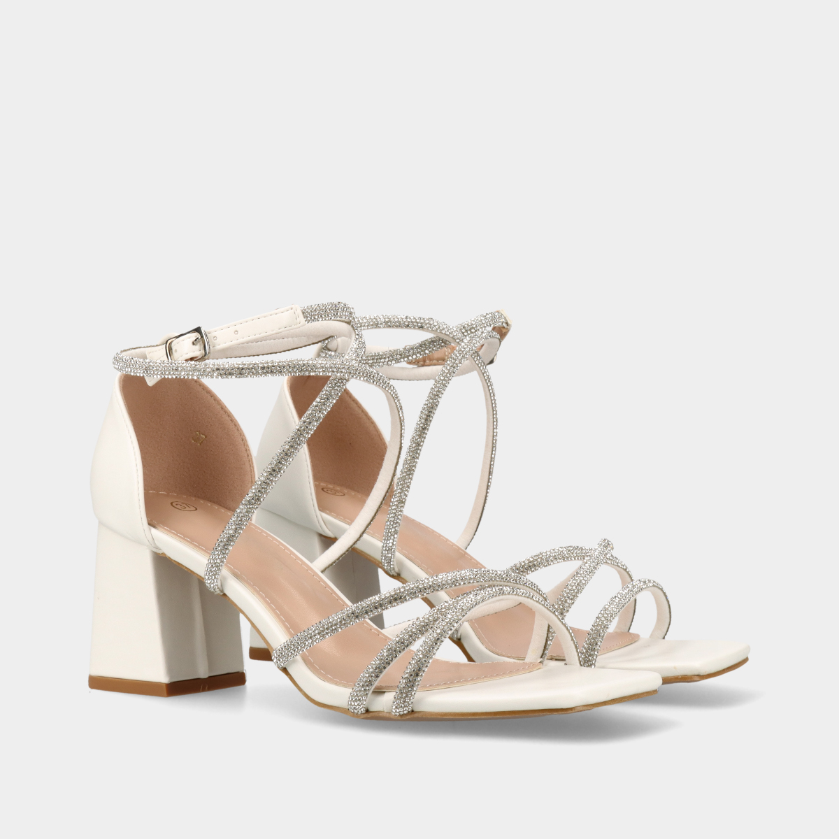 Sandálias brancas de festa, com salto médio largo e fivela ajustável. Confortáveis e elegantes, ideais para casamentos, festas e ocasiões especiais.