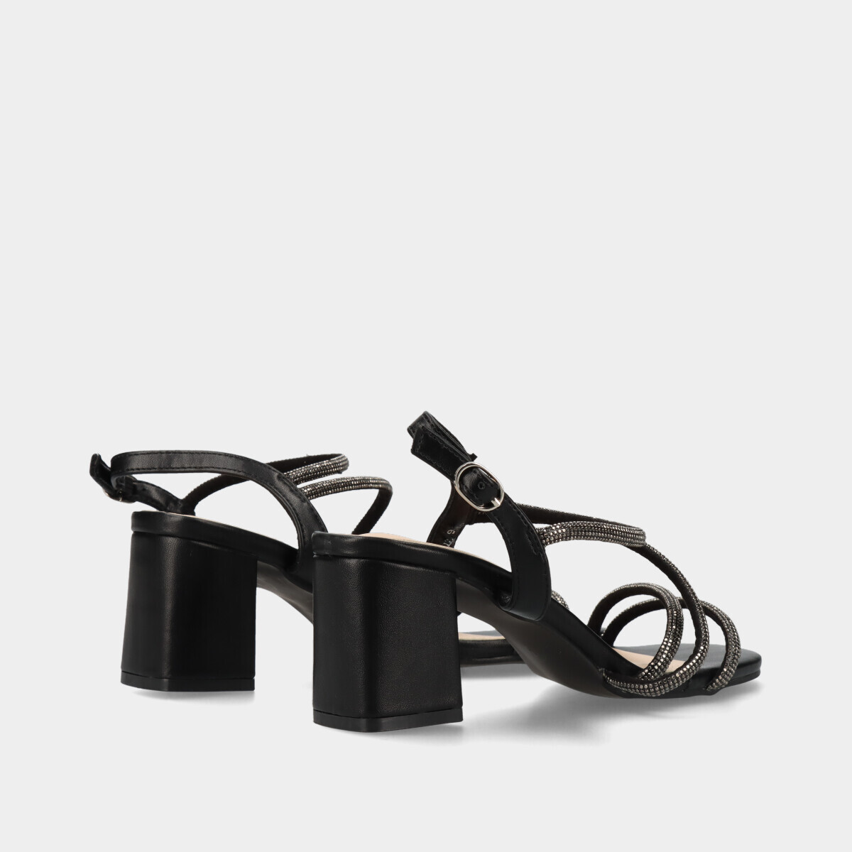 Sandália de festa em preto com tiras de cristais, salto quadrado e fivela lateral para um ajuste perfeito.