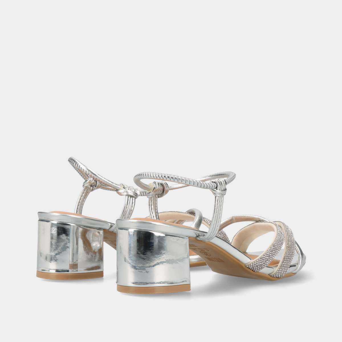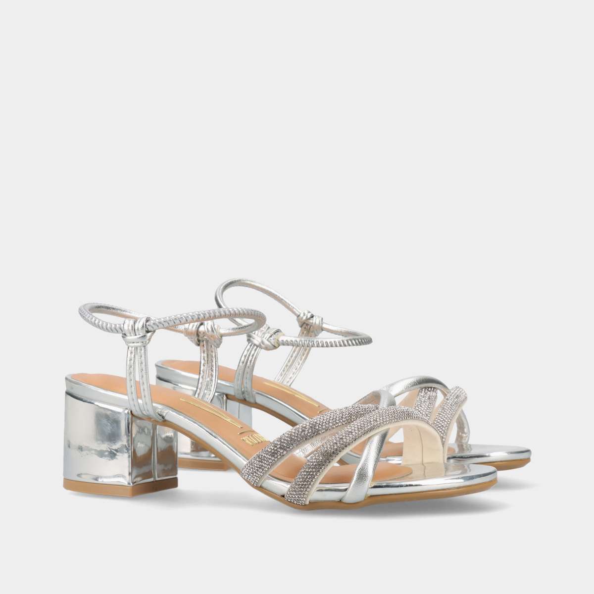 Sandália de salto estável e confortável na cor prateada, com tiras brilhantes e tira elástica para fácil ajuste.