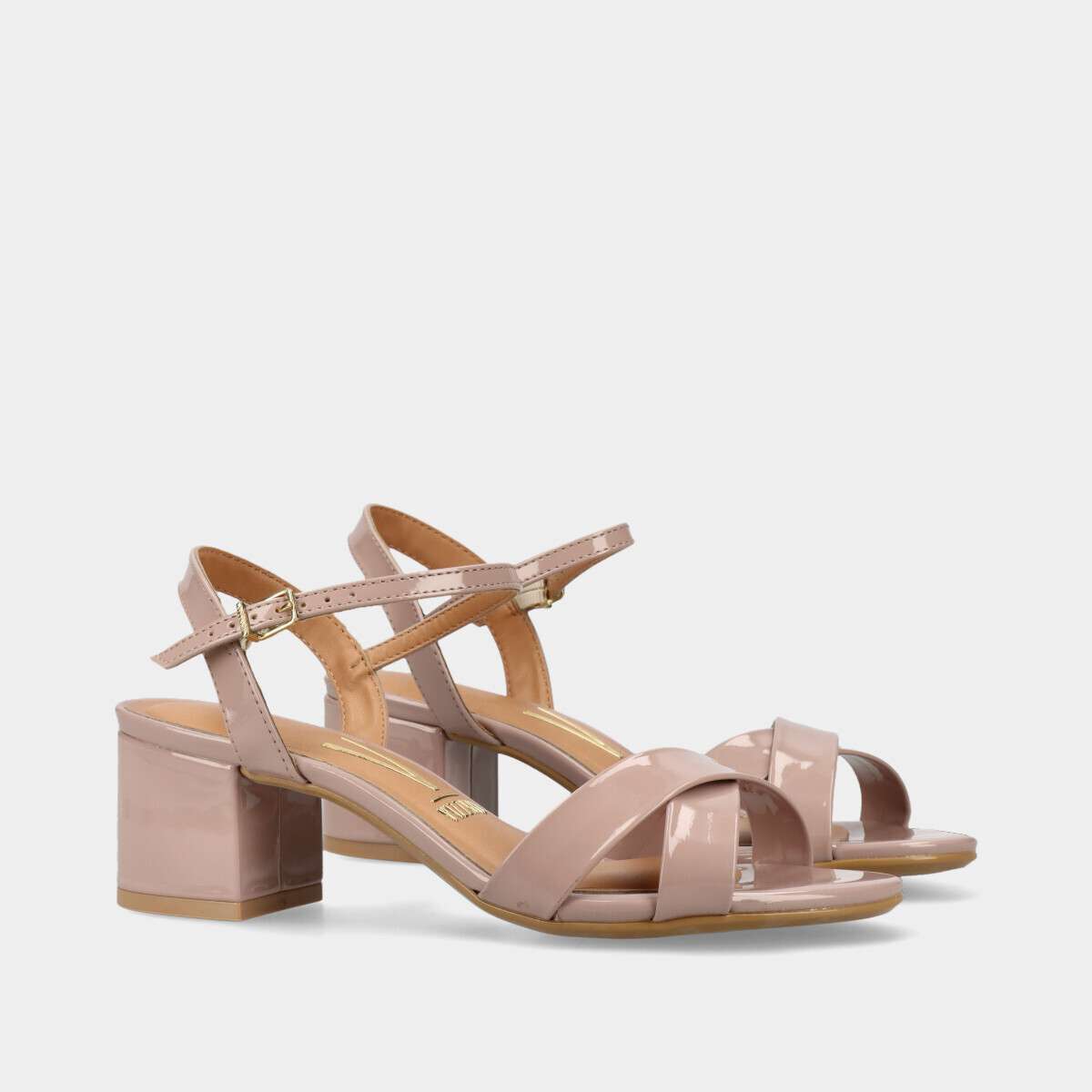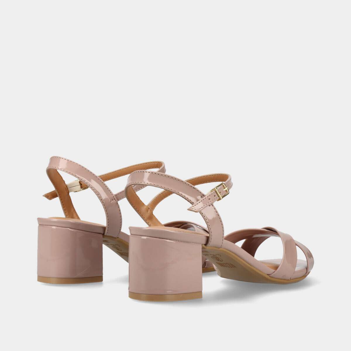Sandália de salto estável e confortável em nude rosado de verniz, com fivela lateral para fácil ajuste.
