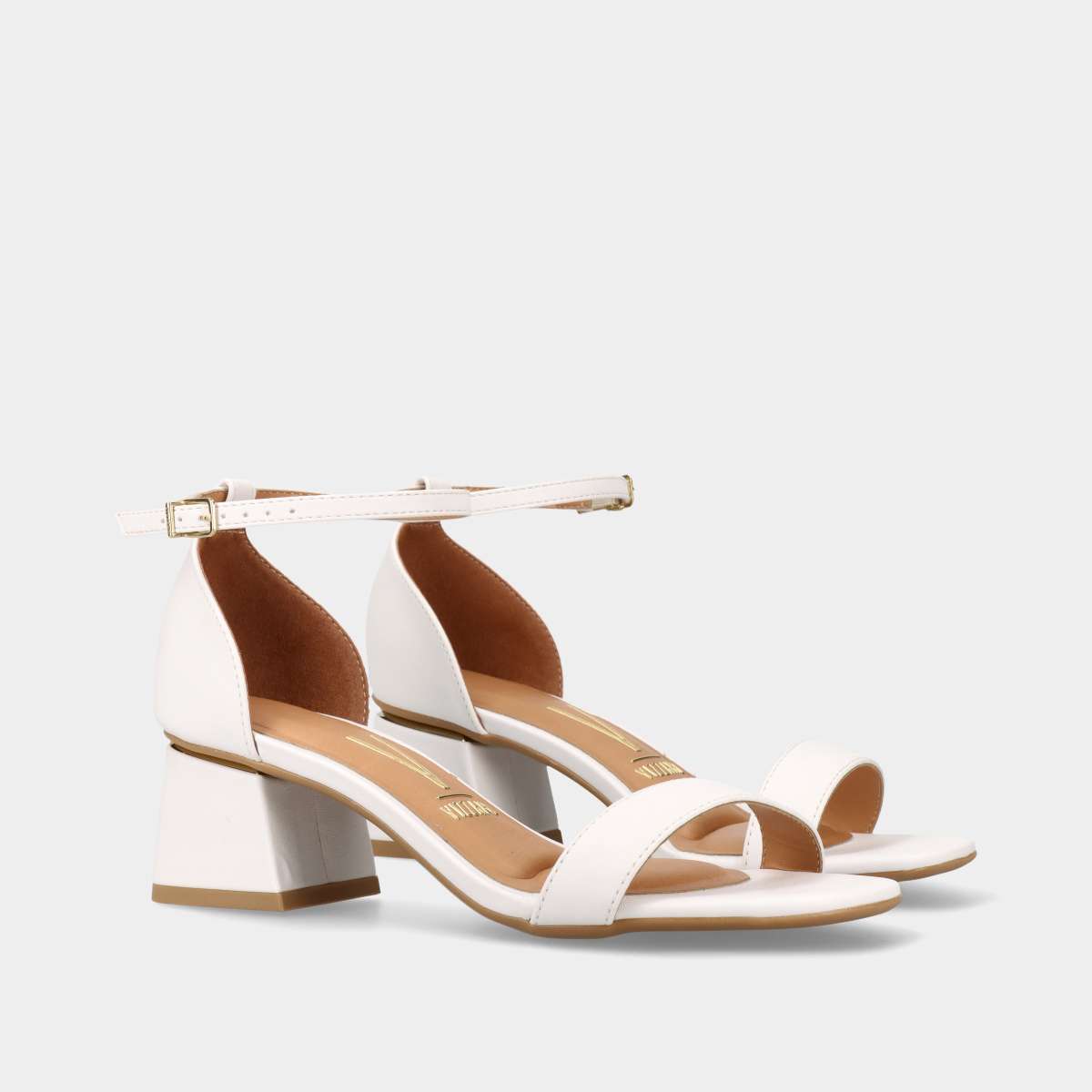 Sandália de salto estável e confortável na cor branca, com pormenor dourado no tacão e fivela lateral para fácil ajuste.