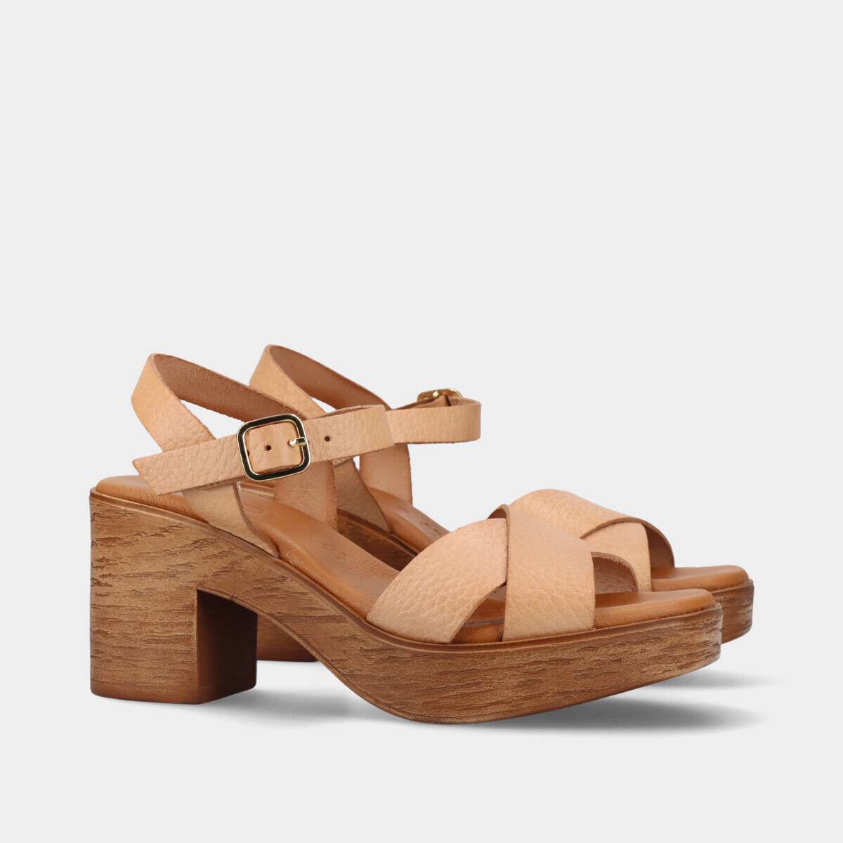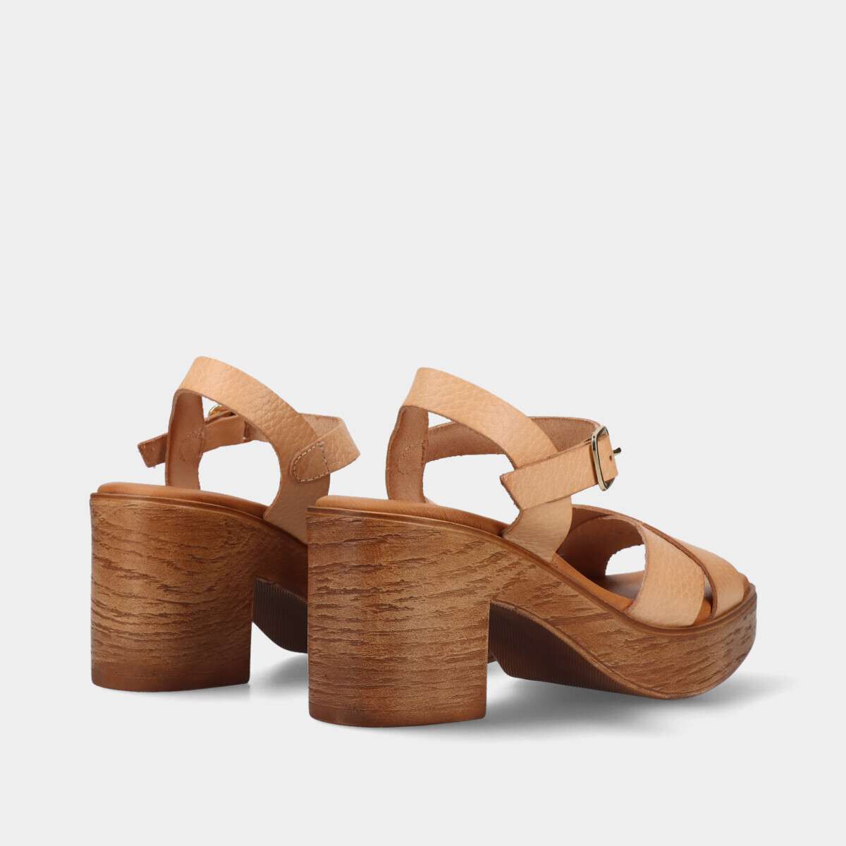 Sandálias de salto largo em pele bege com fivela ajustável e palmilha de espuma muito confortável, ideais para um look de verão elegante e natural.