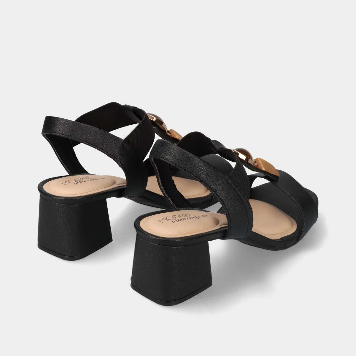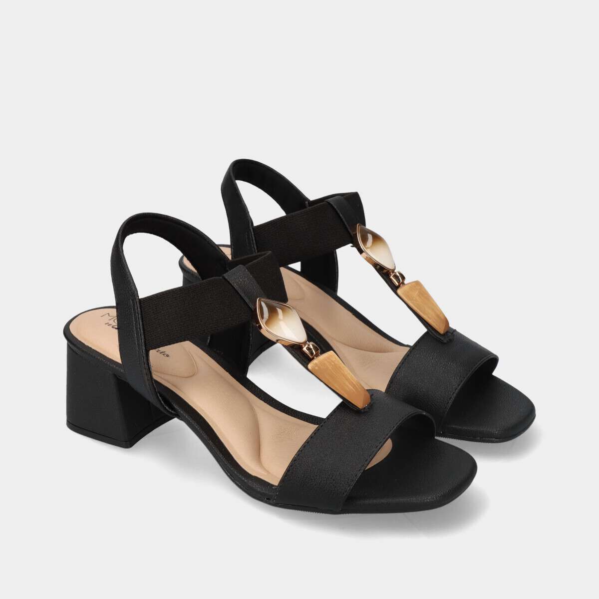 Sandália de salto na cor preta com elástico para fácil ajuste, extremamente confortável.