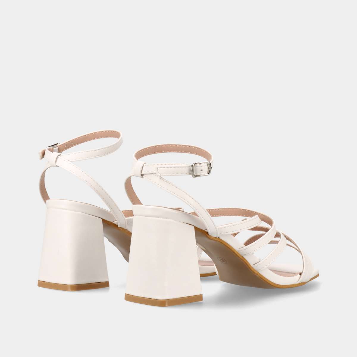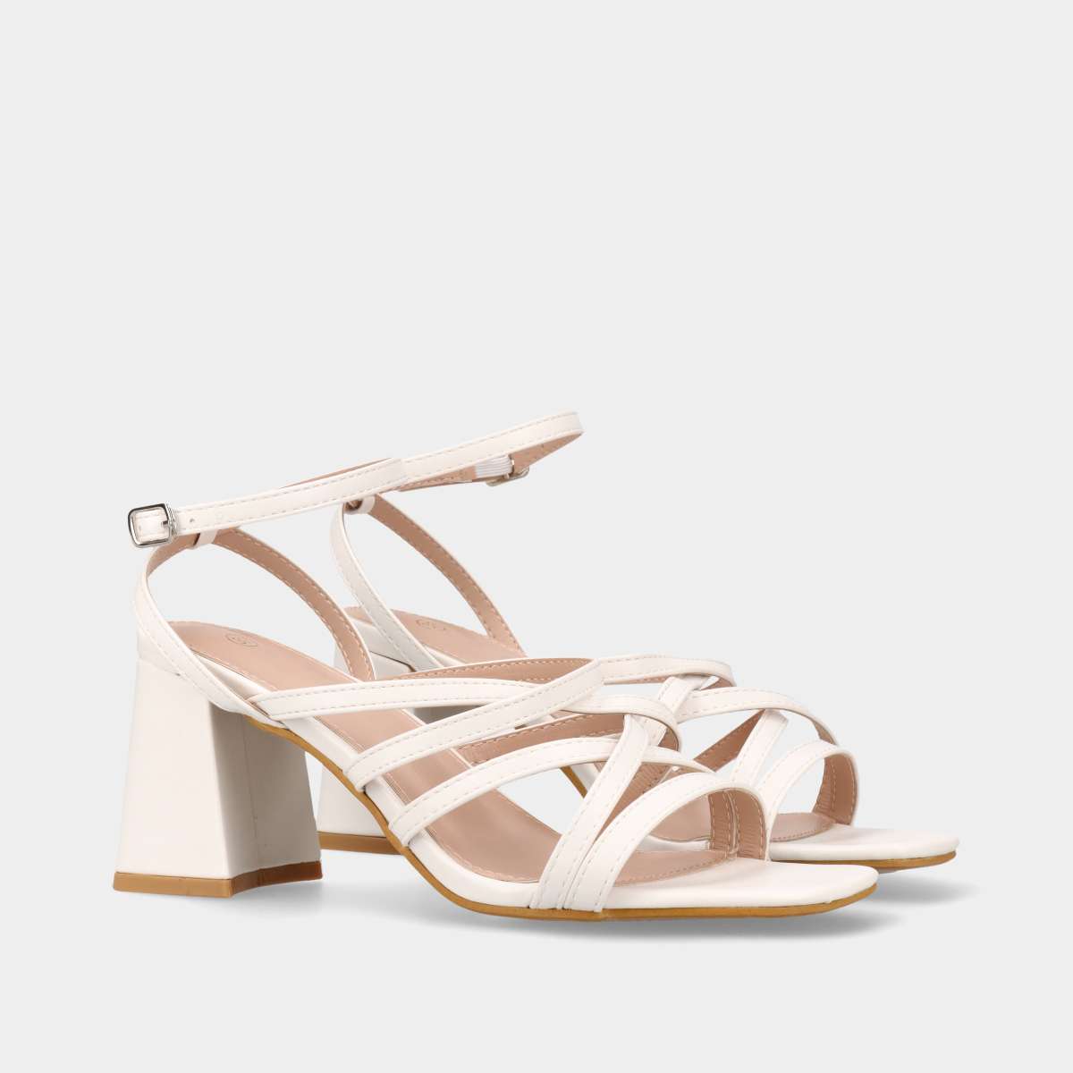 Sandália de festa com salto estável e confortável na cor branca, com fivela lateral para fácil ajuste.