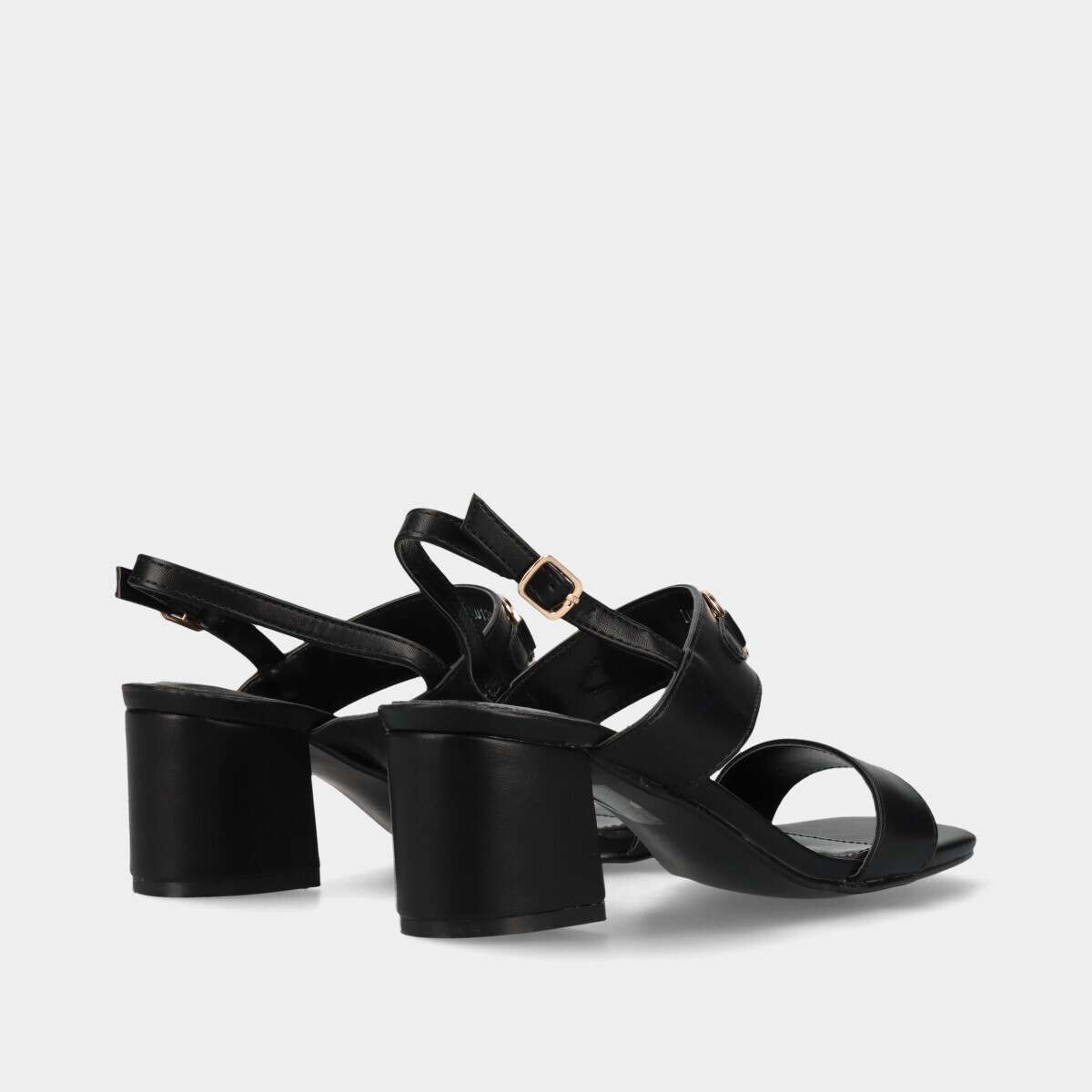 Sandália feminina preta com salto médio, detalhe dourado sobre o peito do pé e tira traseira com fivela lateral para ajuste seguro.