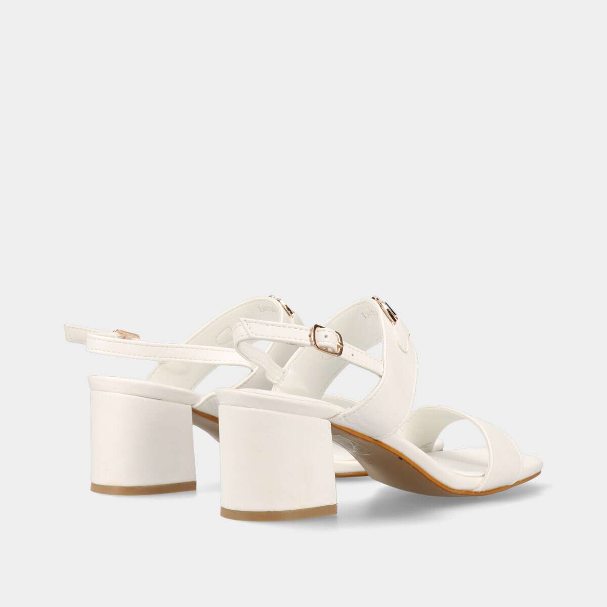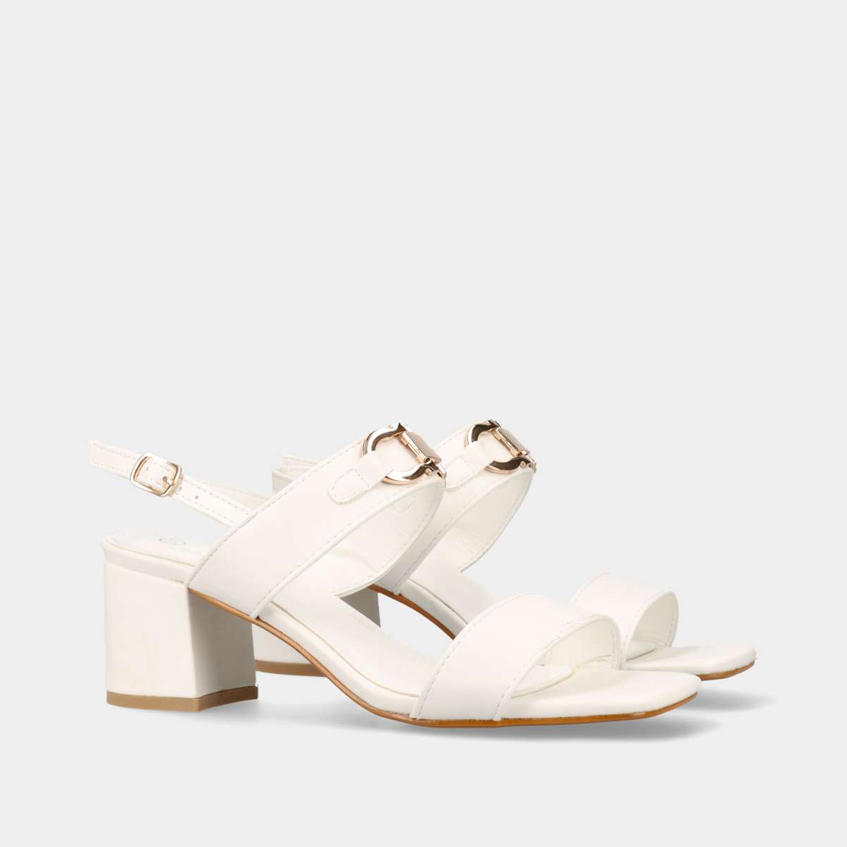 Sandália feminina branca com salto médio, detalhe dourado sobre o peito do pé e tira traseira com fivela lateral para ajuste seguro.
