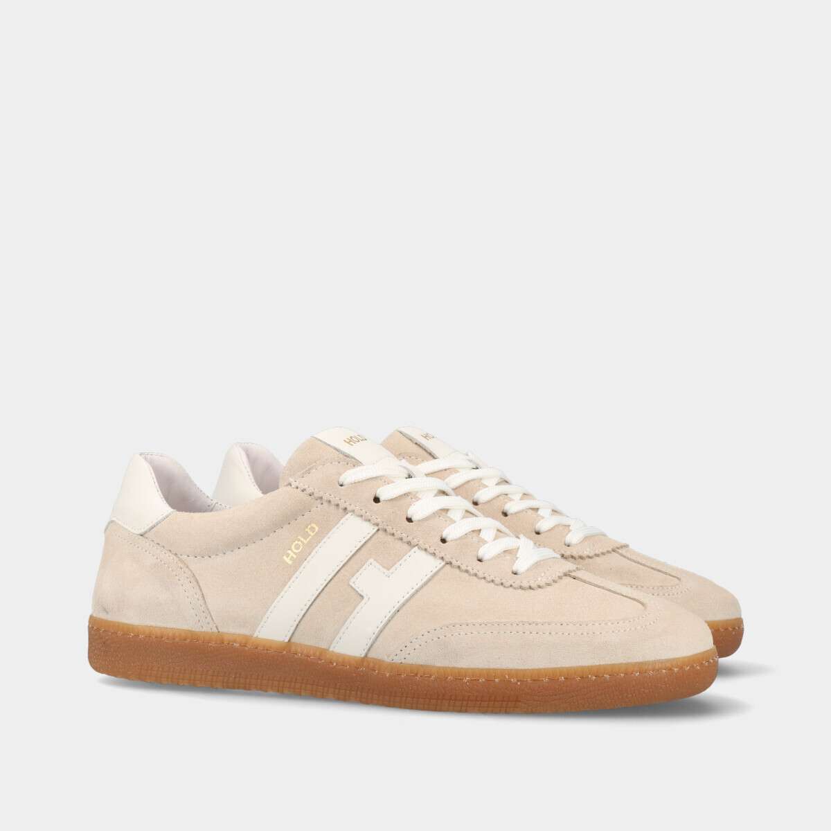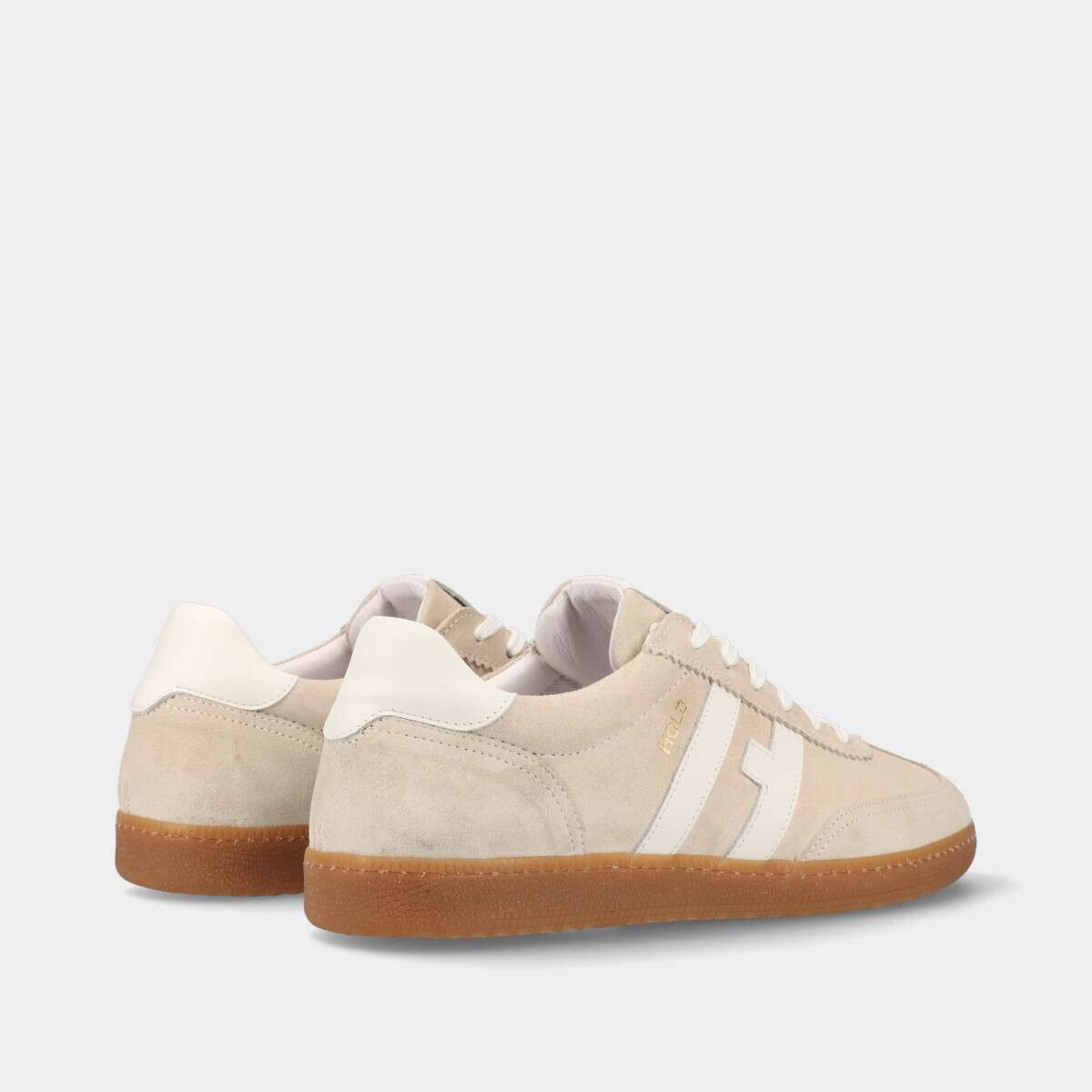 Tênis casual em pele camurça na cor bege com pormenores em pele lisa, de cordão.