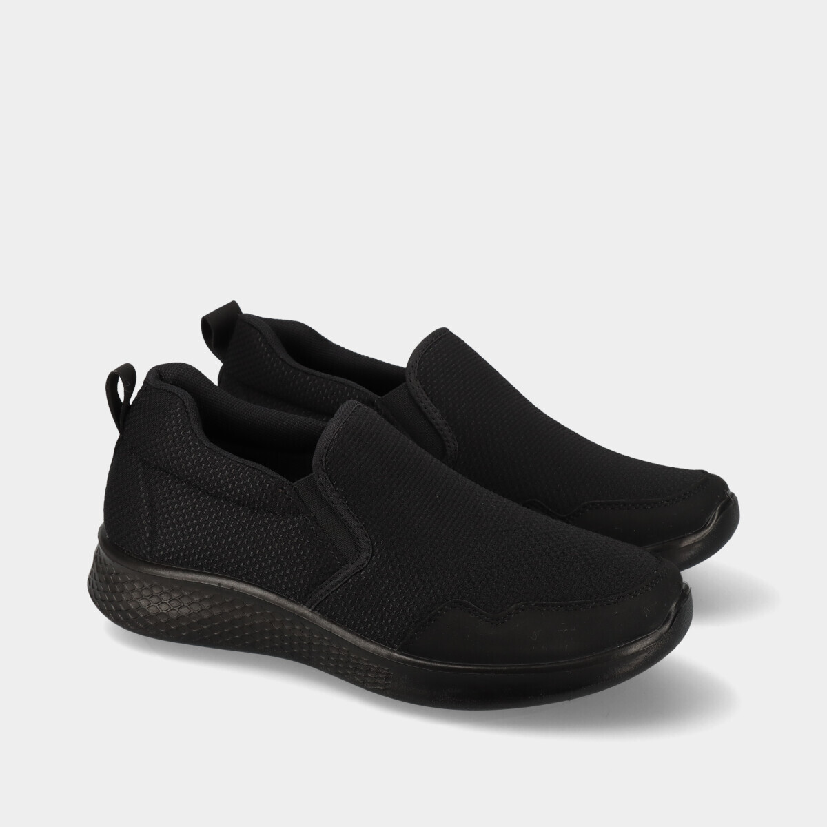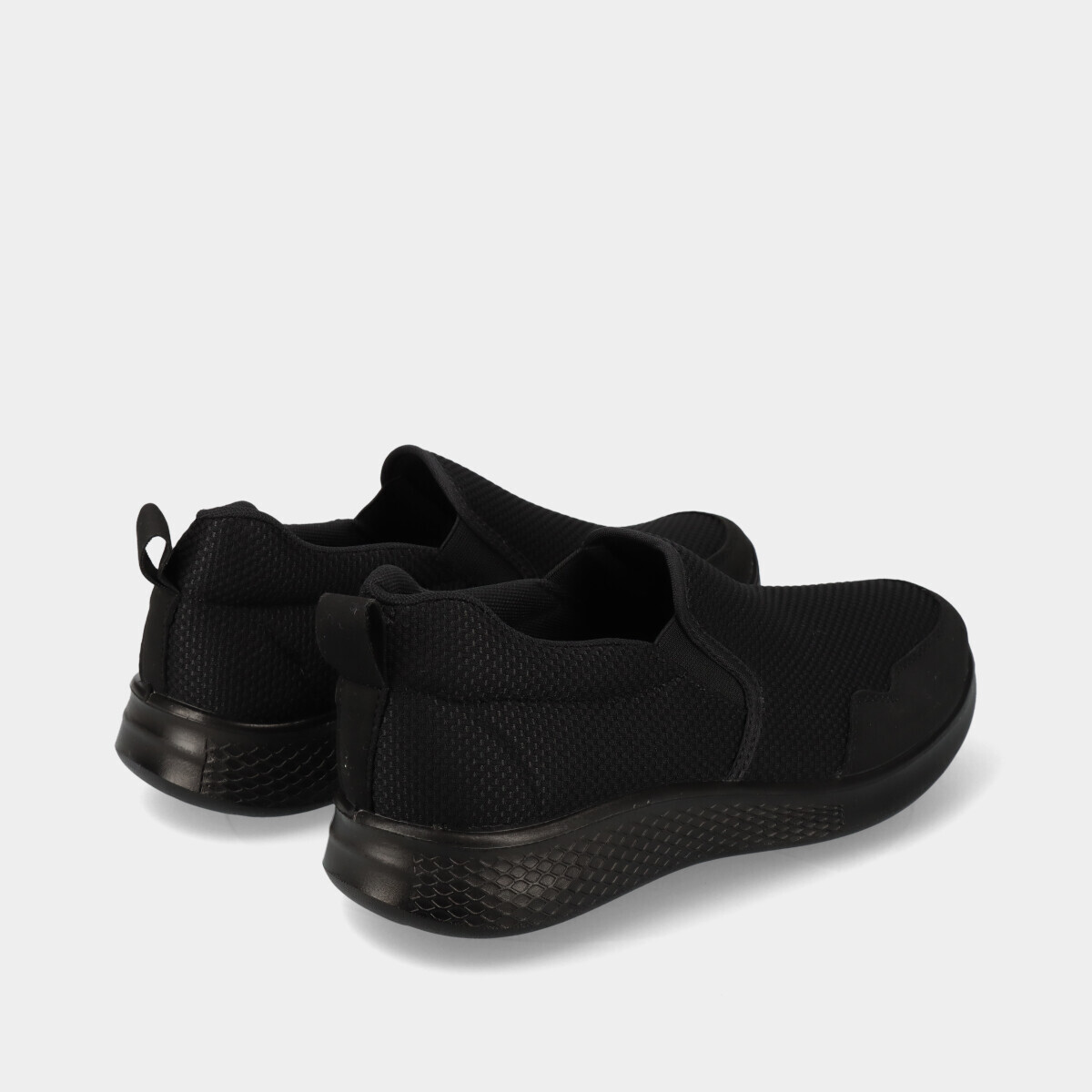 Ténis slip-on para homem em malha respirável preta, com rebordos acolchoados e palmilha removível, fácil de calçar e ideal para uso casual.