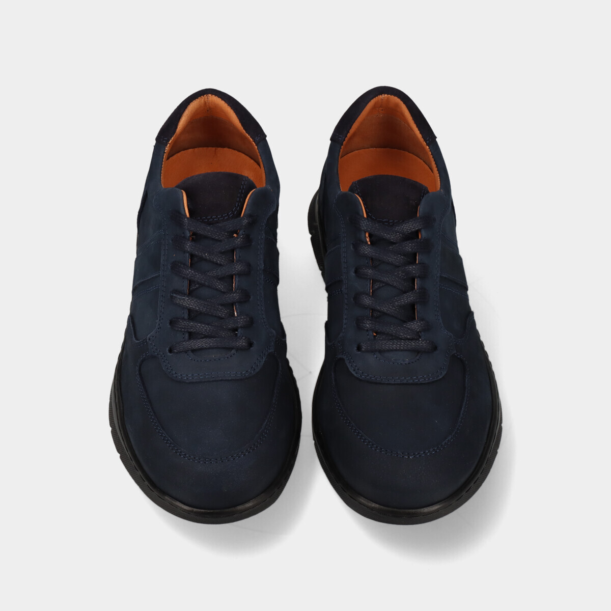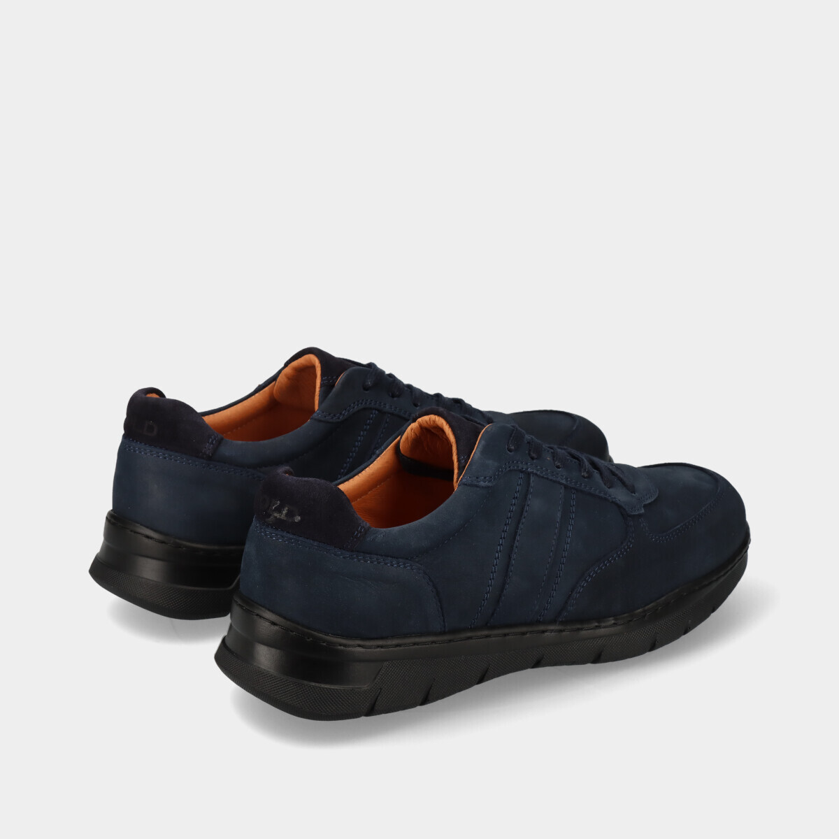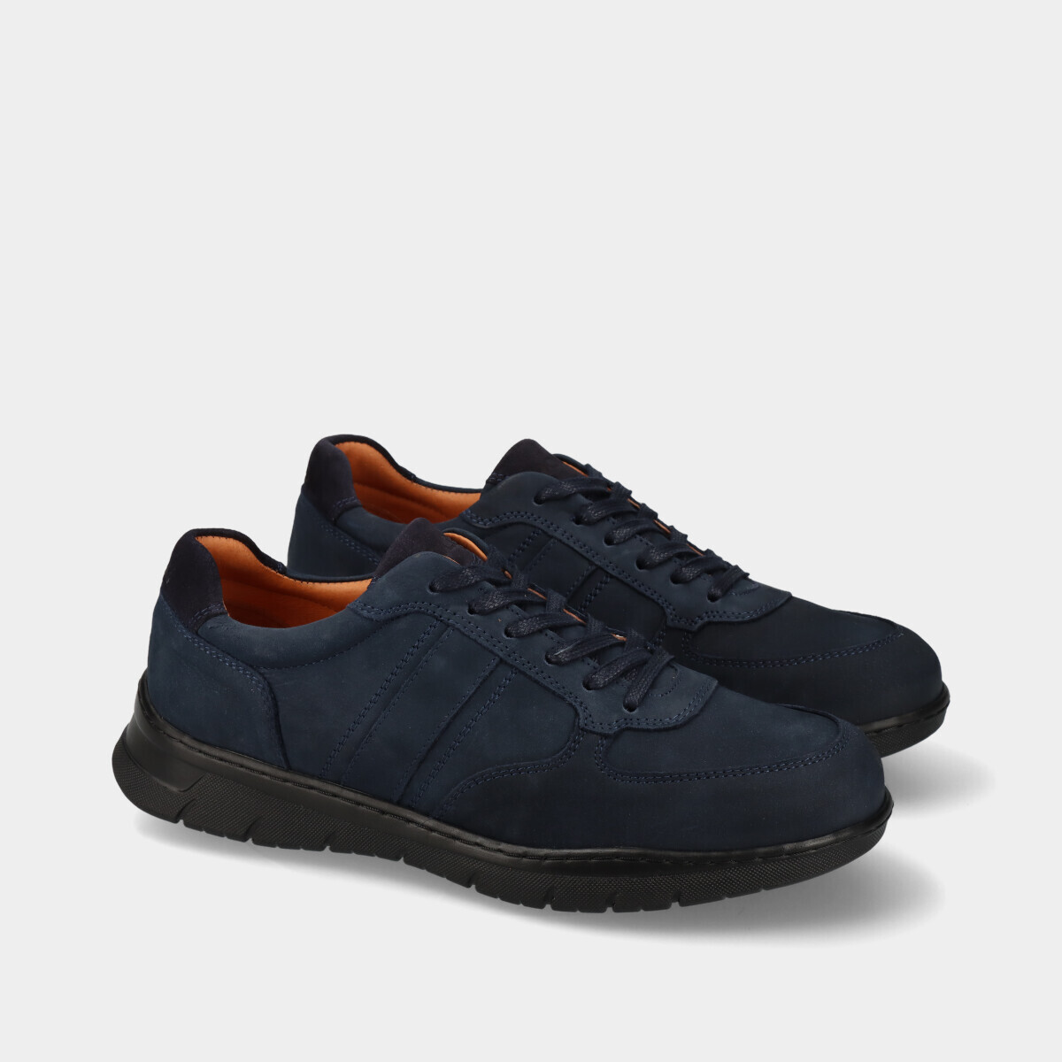 Ténis em pele nobuck azul para homem, com sola de borracha, palmilha removível e atacadores. Práticos e de qualidade nacional, ideais para o dia a dia.
