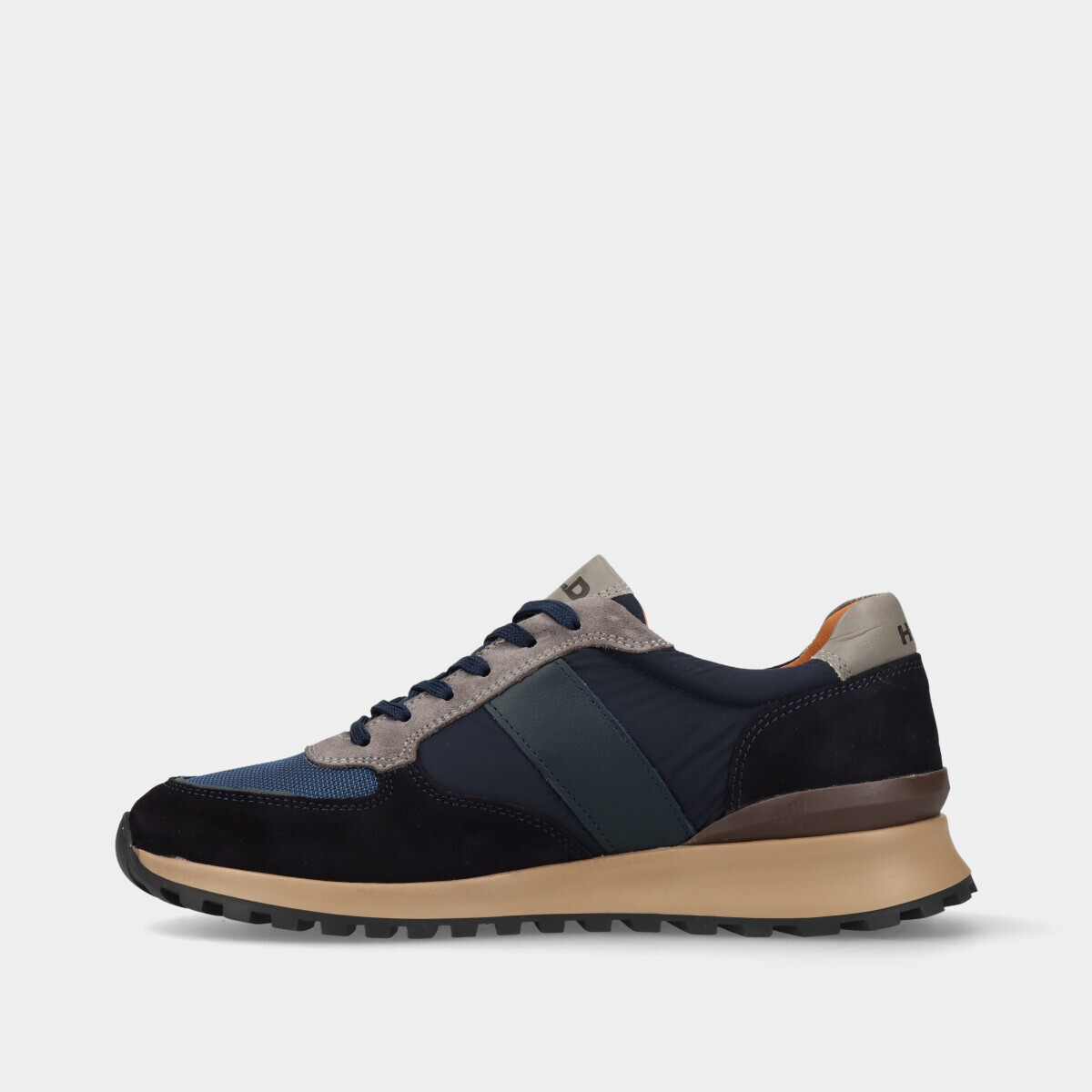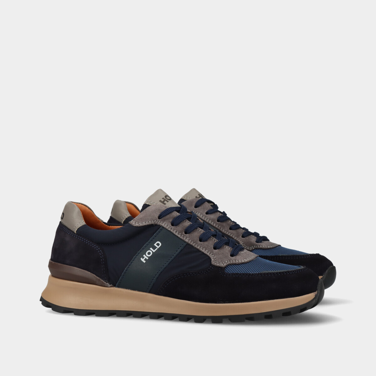 Ténis casuais em pele para homem na cor azul, com atacadores e detalhes em cinza, nylon, rede mesh e camurça.