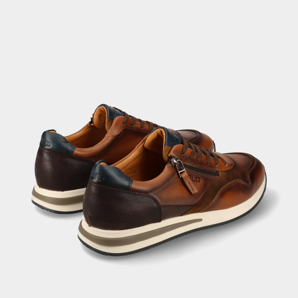 Ténis em pele camel para homem, com sola de borracha, palmilha removível, atacadores e fecho lateral. Práticos e de qualidade nacional, ideais para o dia a dia.