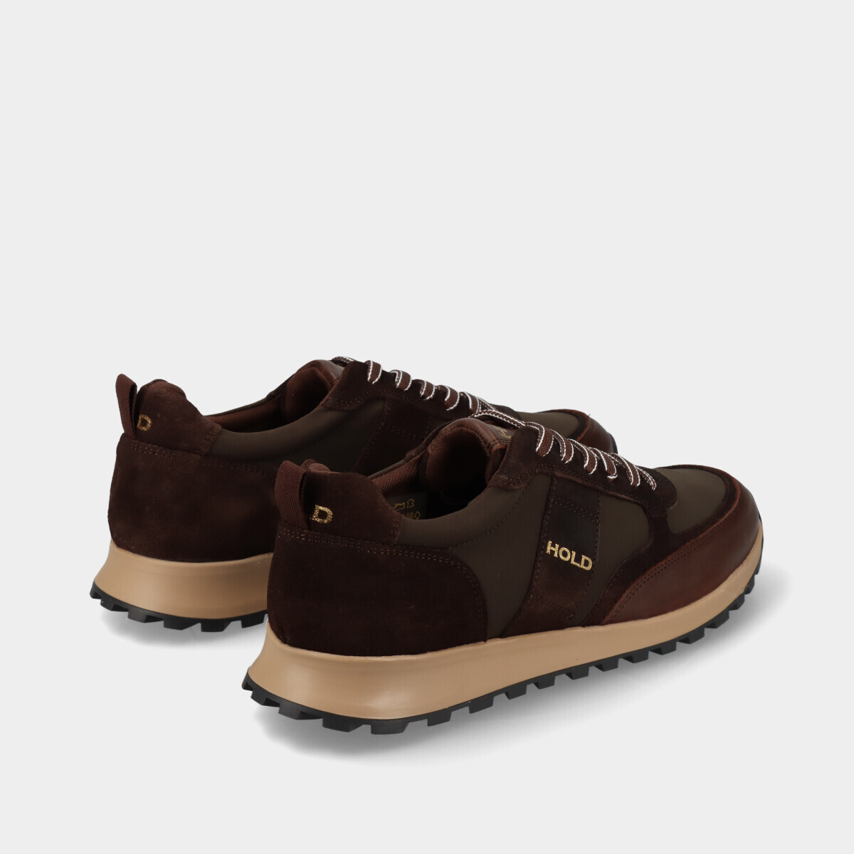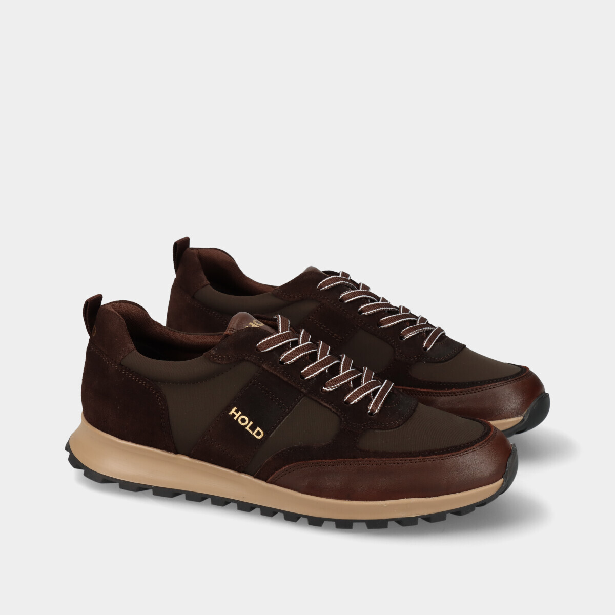 Ténis em pele castanha para homem, com diferentes texturas, sola robusta, palmilha removível e atacadores. Práticos e de qualidade nacional, ideais para o dia a dia.