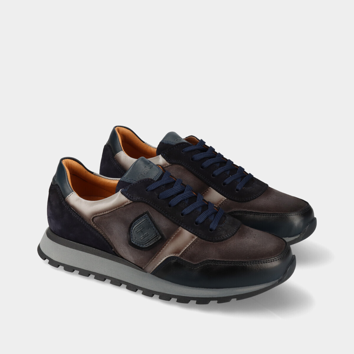 Ténis em pele azul para homem, com sola branca robusta, palmilha removível e atacadores. Práticos e de qualidade nacional, ideais para o dia a dia.