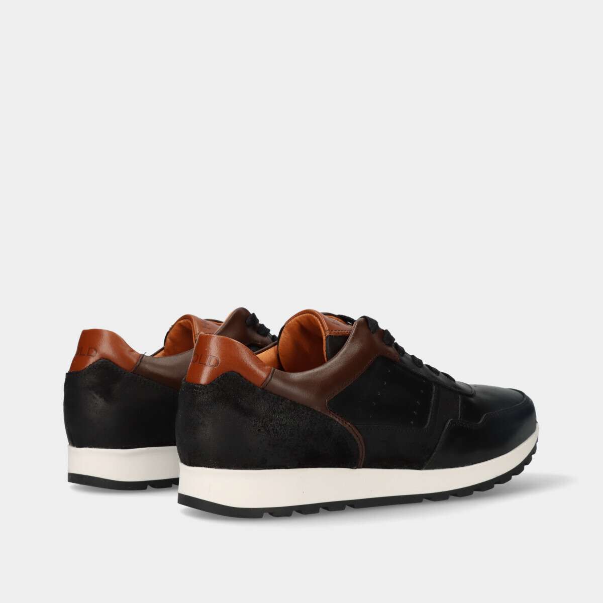 Sapatilha em pele de cordão na cor preta com pormenores em castanho.