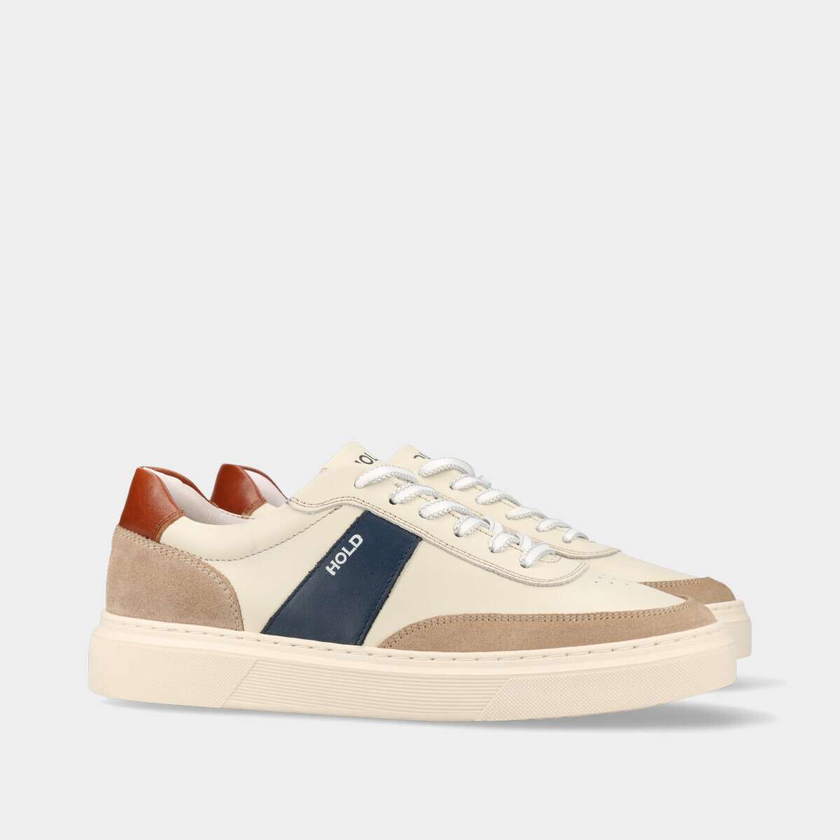 Tênis casual masculino, em pele off-white com contraste em azul, castanho e camurça taupe, de cordão. Fabricado em Portugal.