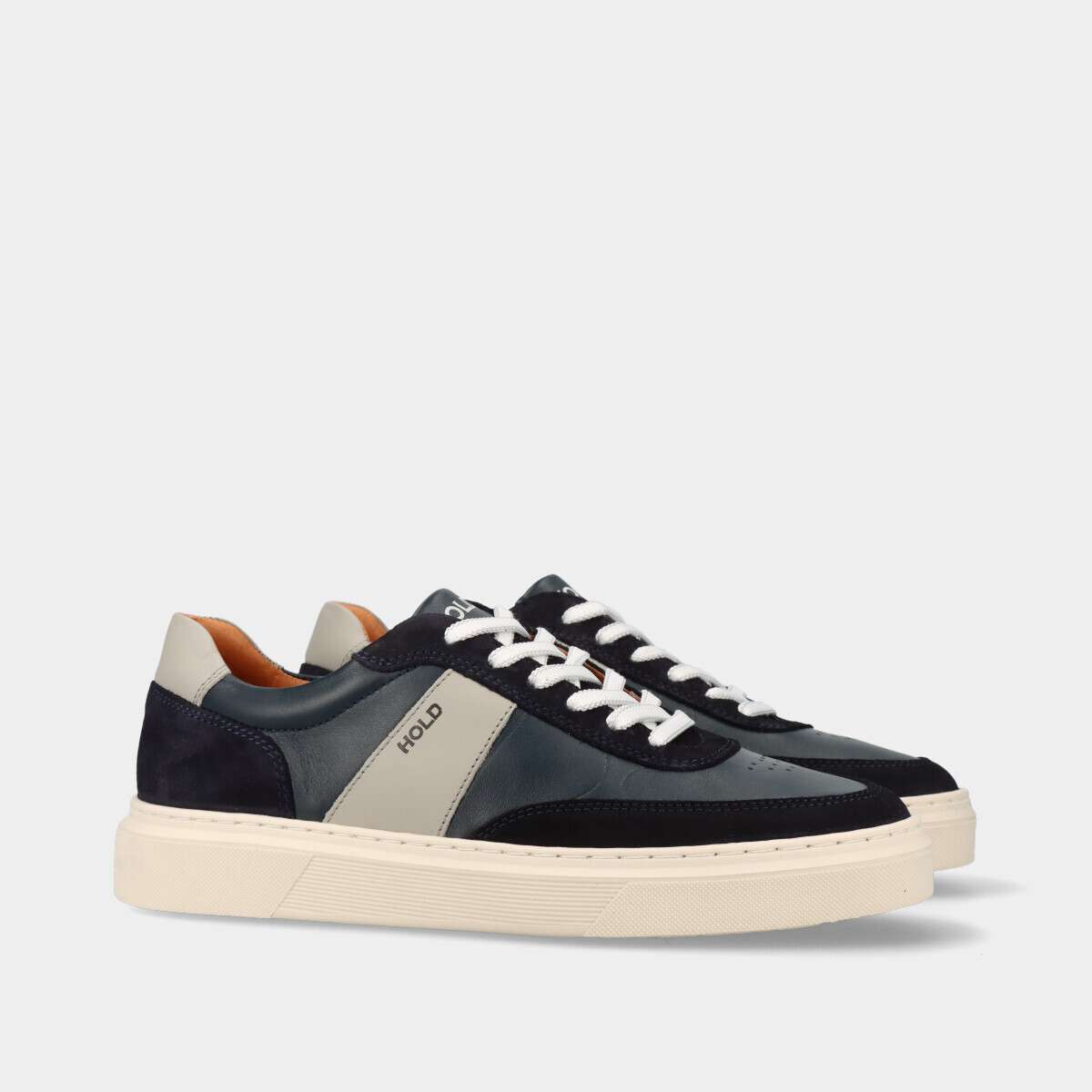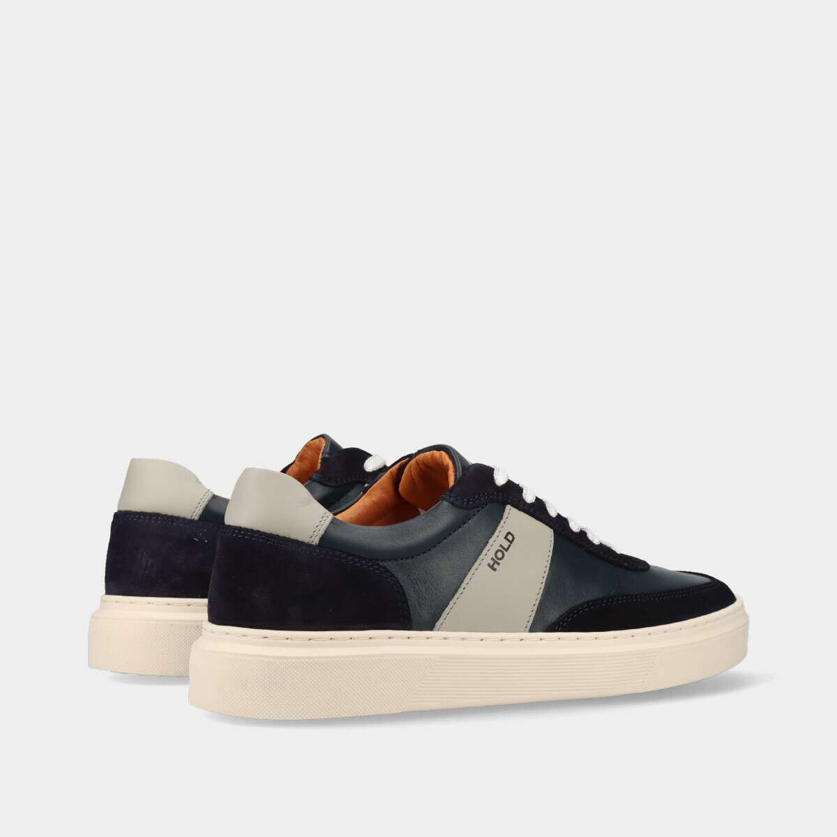 Ténis casual masculino, em pele azul com contraste em cinza, de cordão. Fabricado em Portugal.