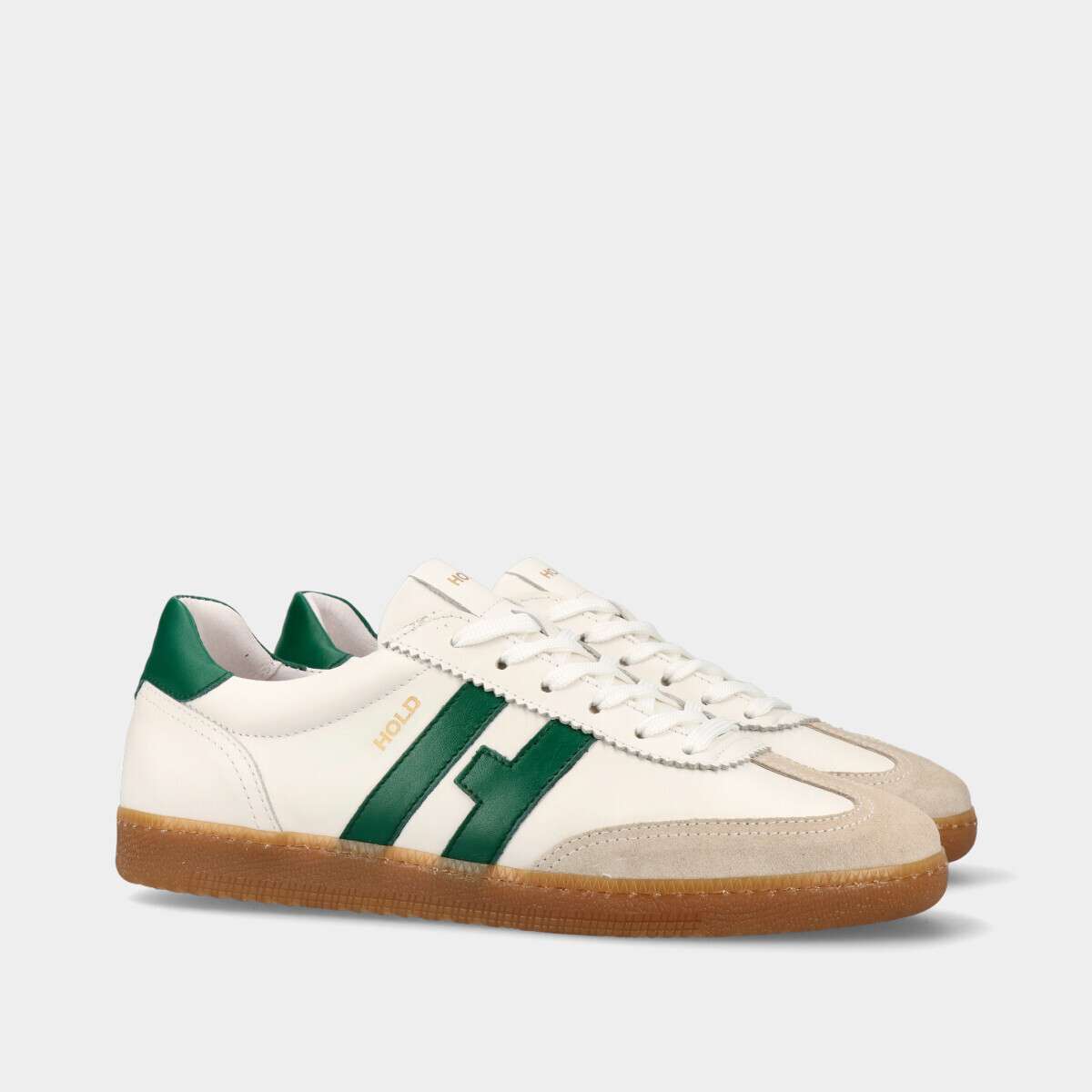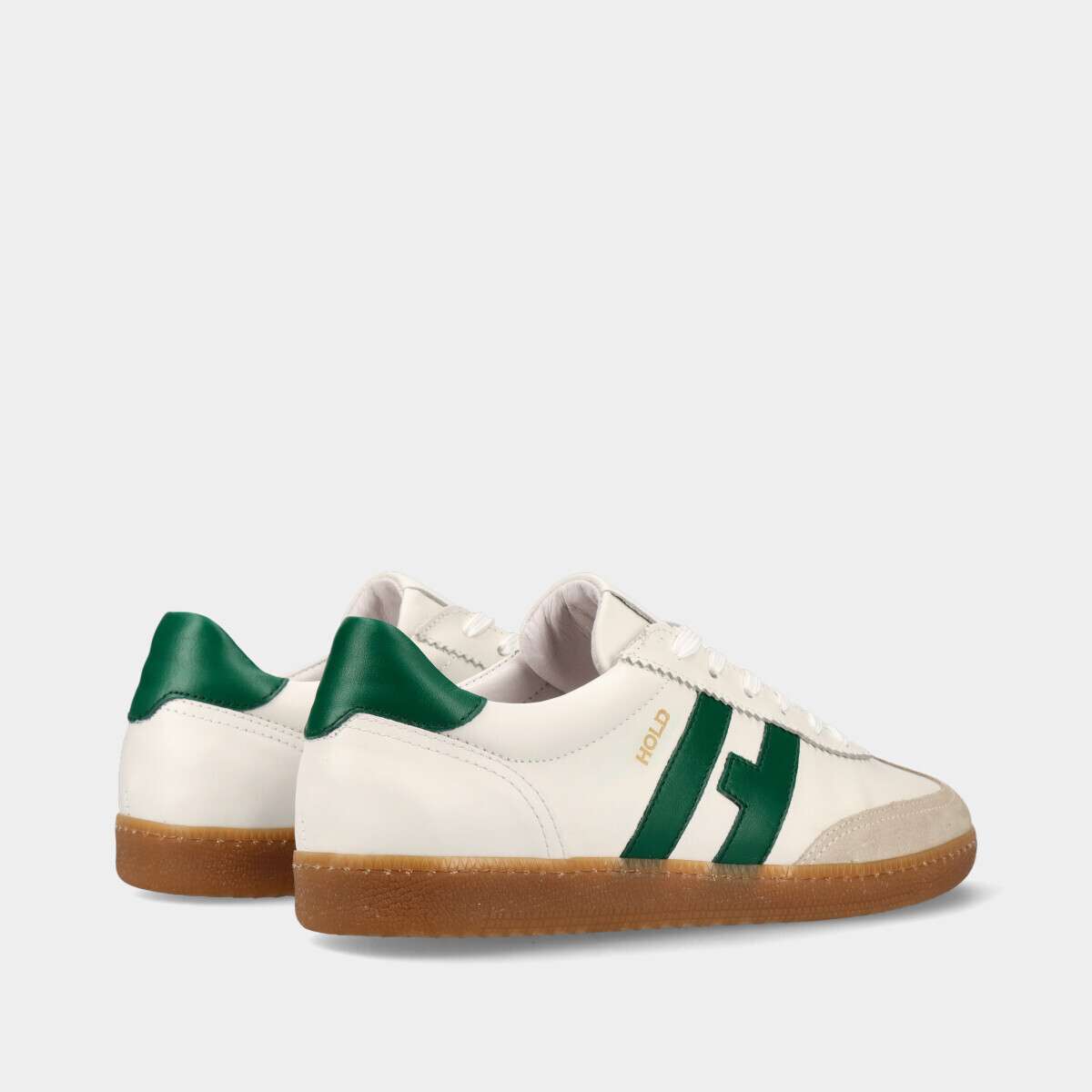 Tênis casual em pele na cor branca com pormenores em verde, de cordão.