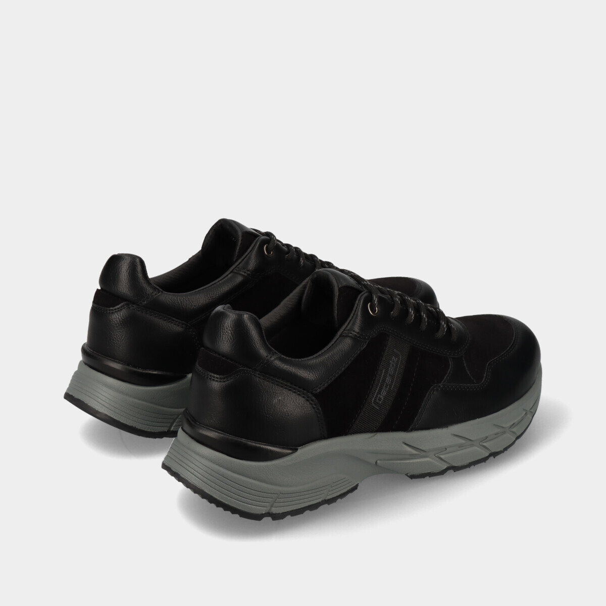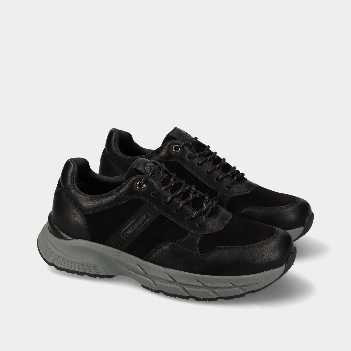 Ténis confortáveis para homem em preto, com sola leve, palmilha acolchoada e atacadores, ideais para conforto diário.
