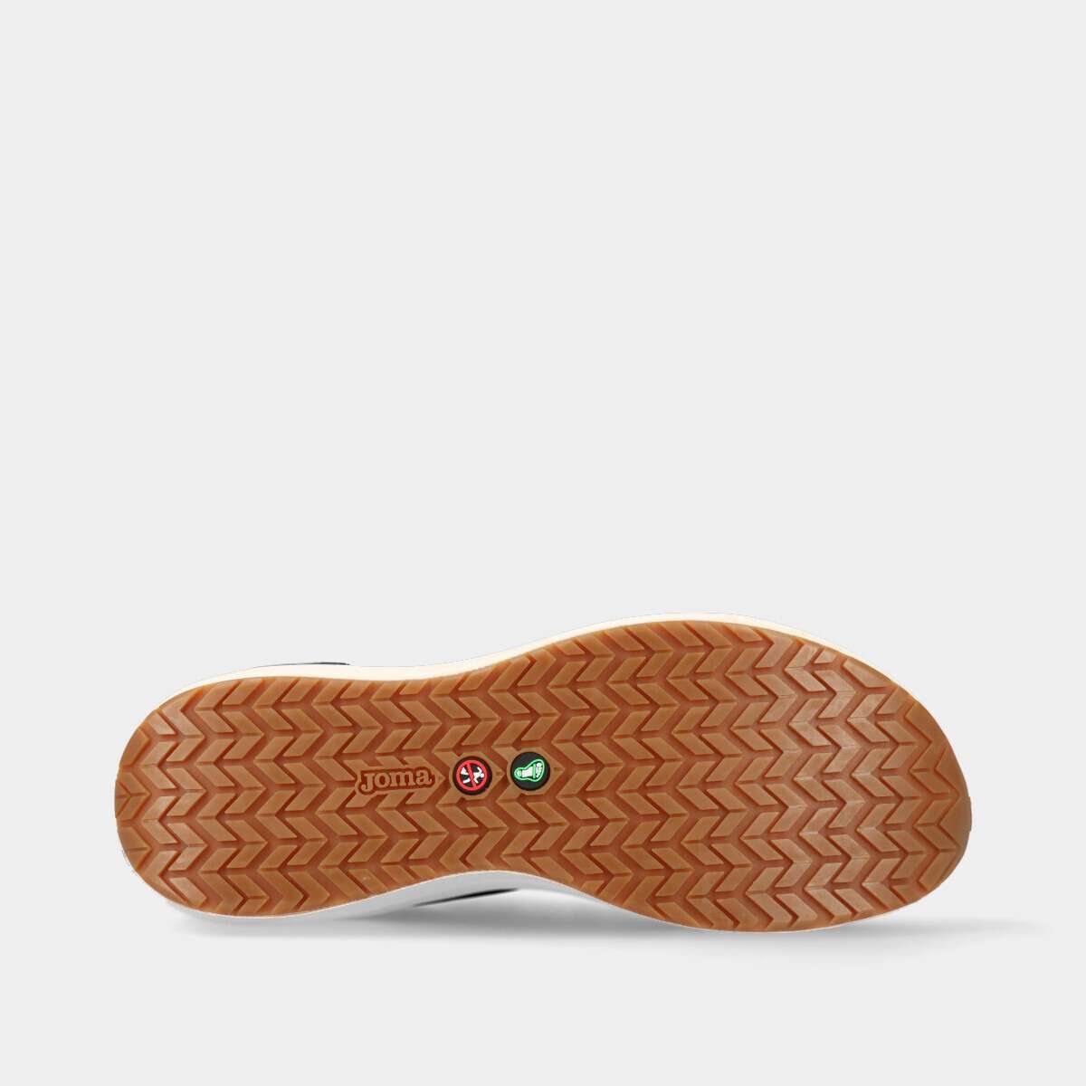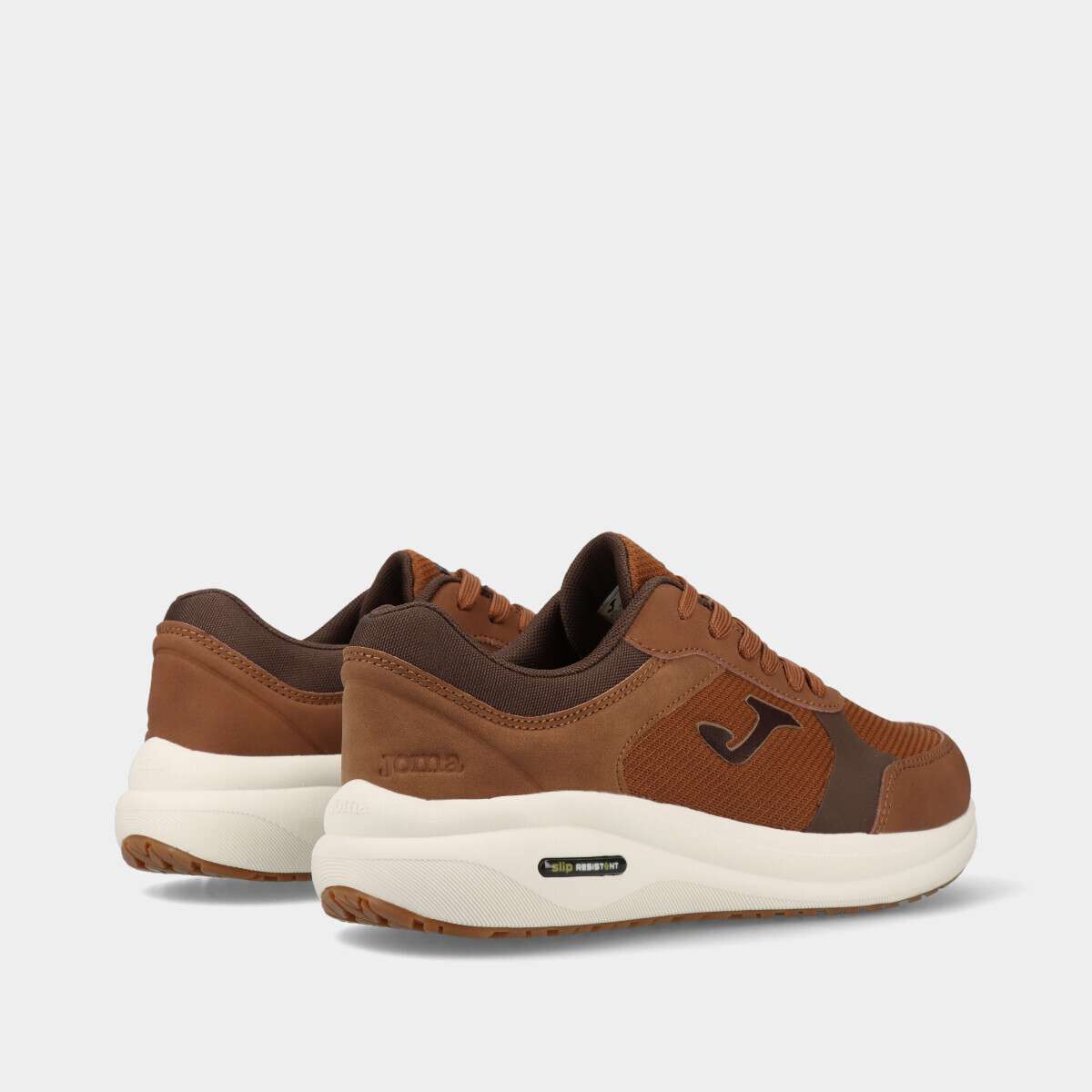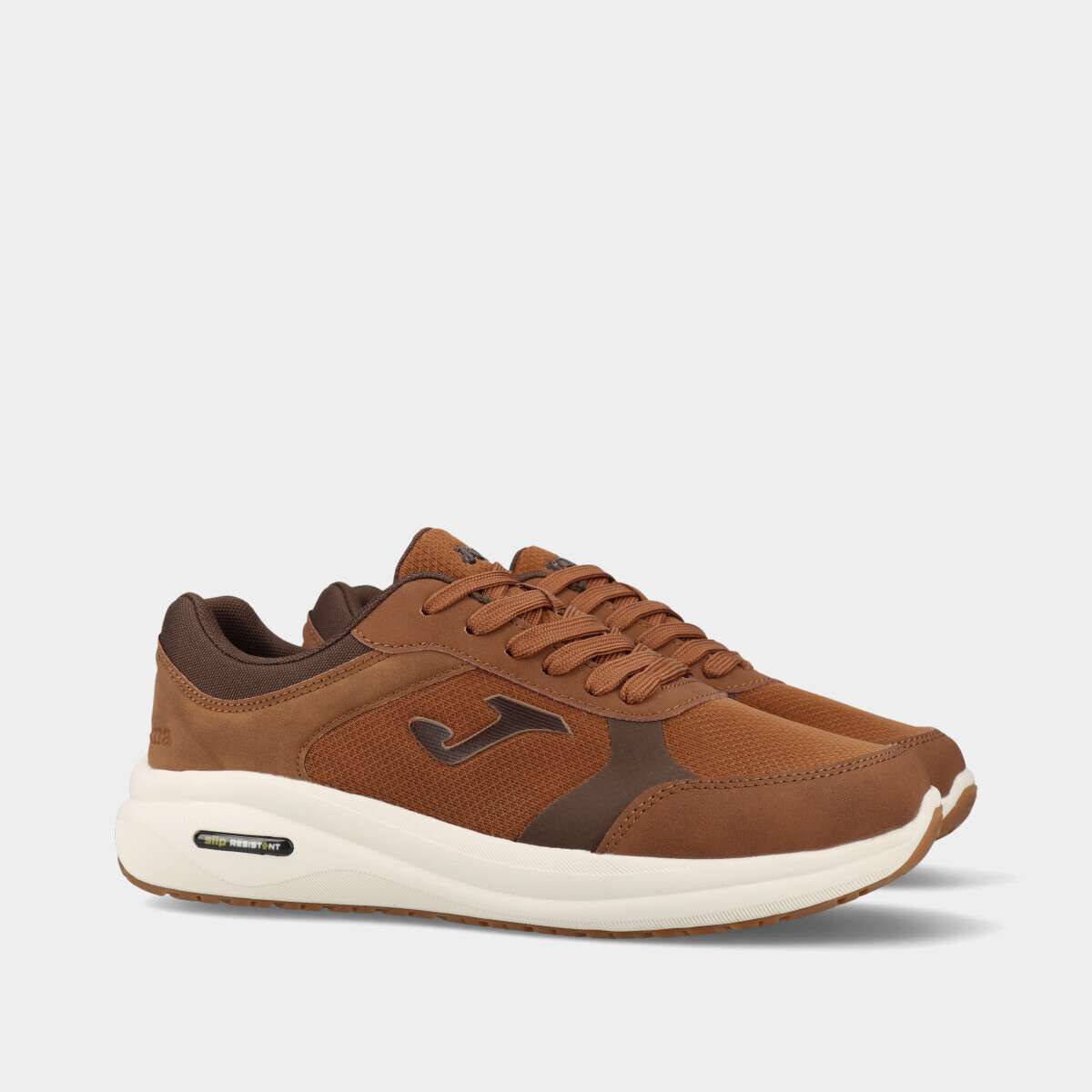 Tênis na cor castanha com forma larga, palmilha memory foam removível, sola antiderrapante e cordão.