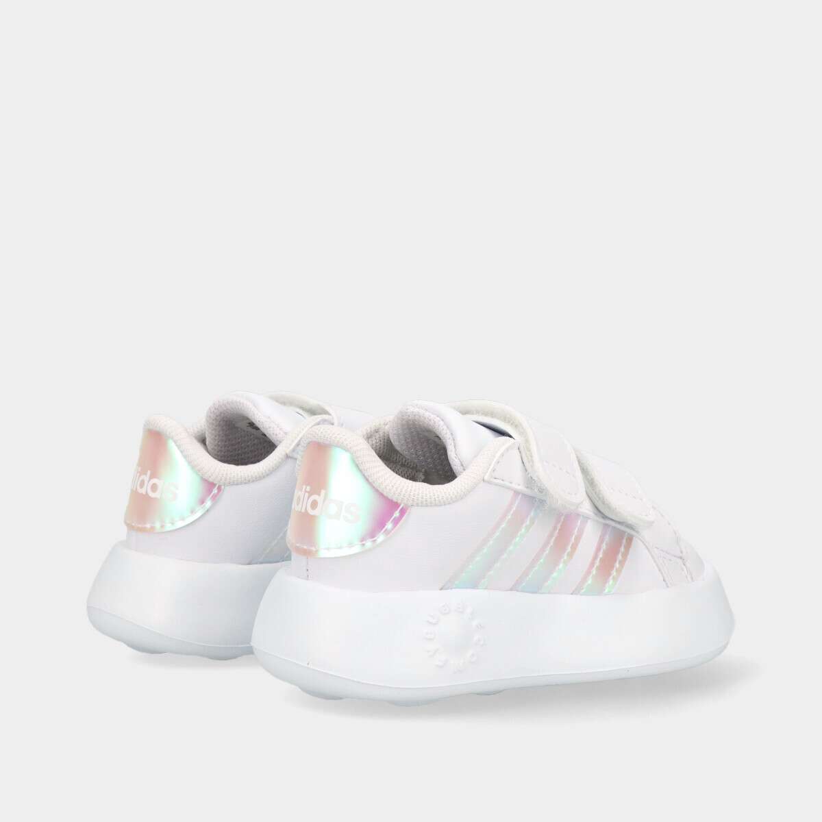 Tênis na cor branca com pormenores iridescentes, fecho de velcros e sola às bolinhas em EVA.