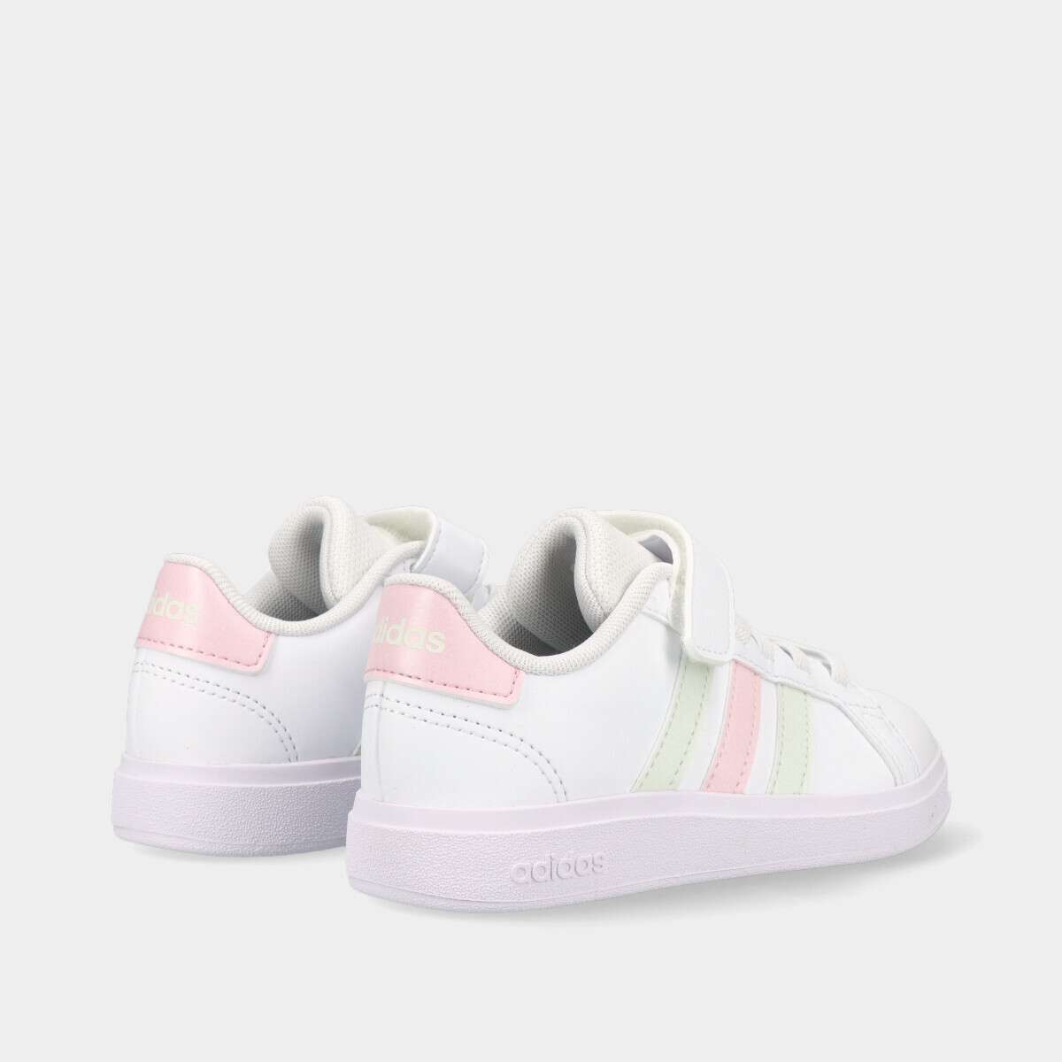 Tênis na cor branca com pormenores de cores brilhantes, velcro e cordão elástico.