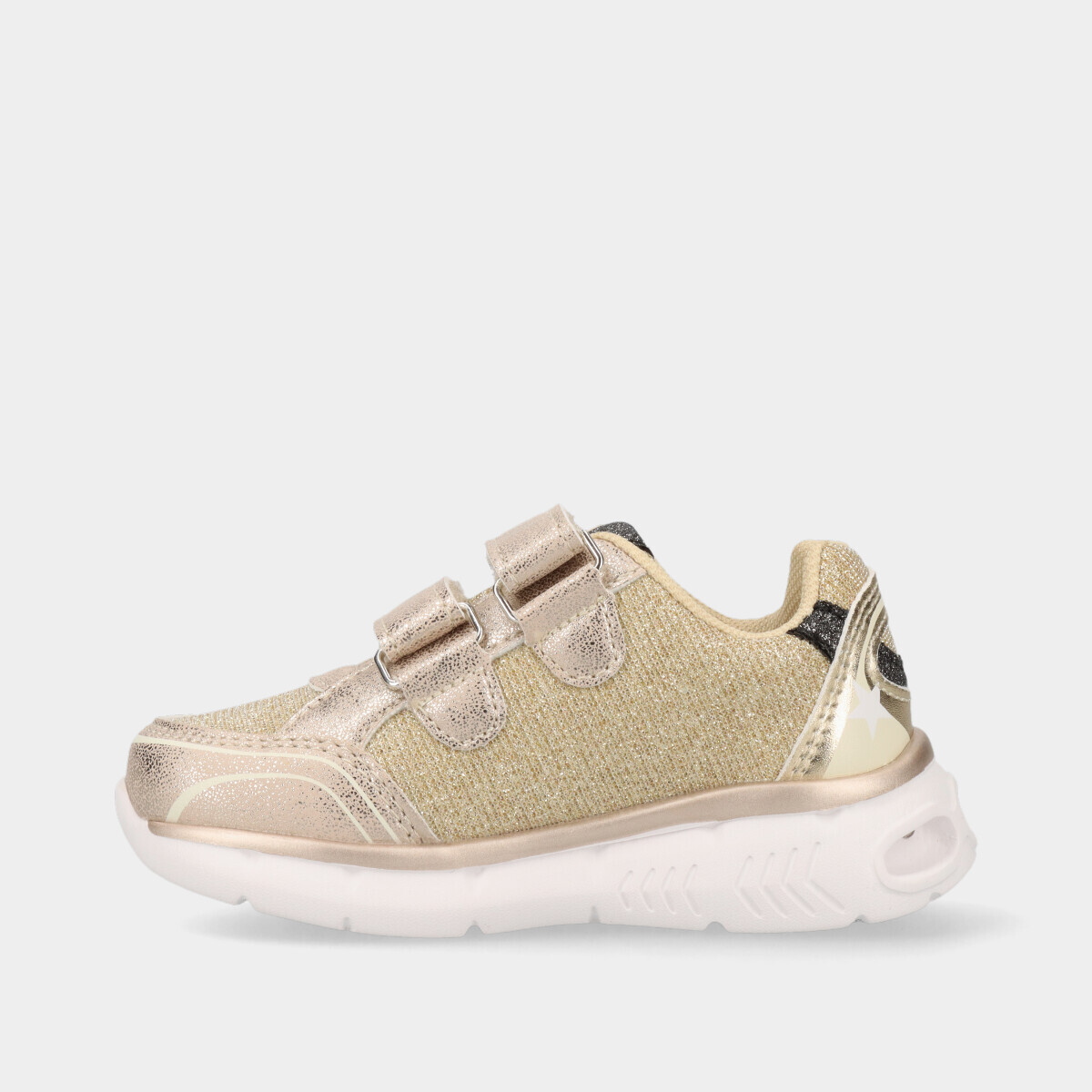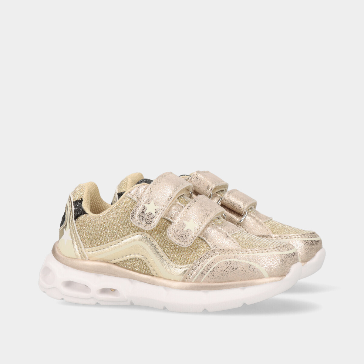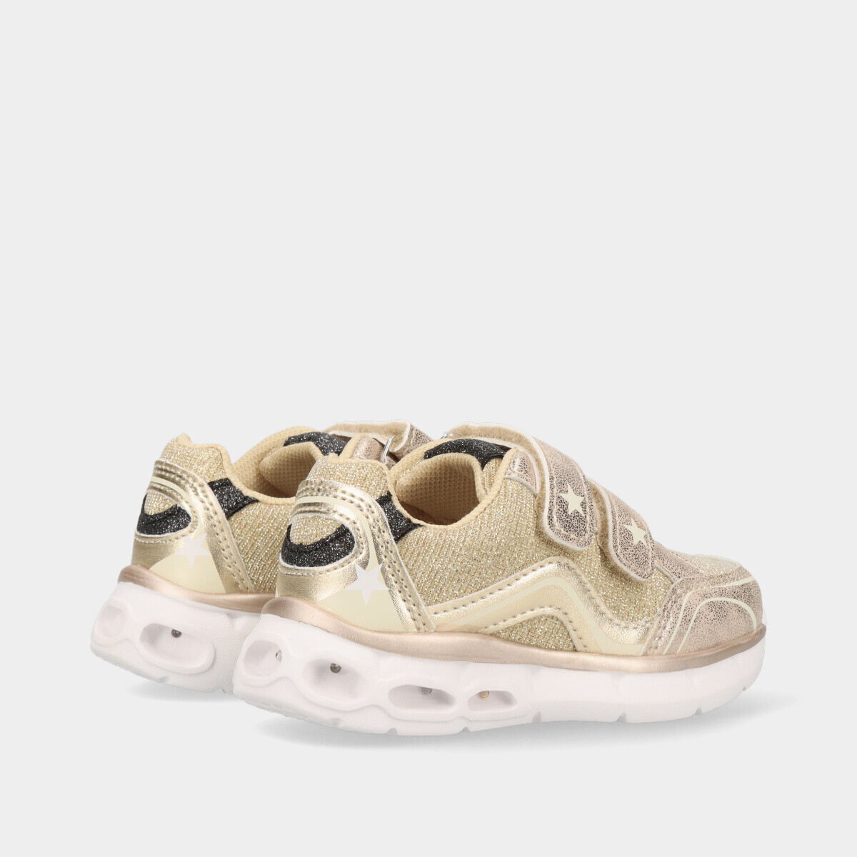 Ténis Chicco para menina em dourado com detalhes pretos e luzes coloridas que se acendem ao caminhar. Leves e confortáveis, ideais para a escola e fáceis de calçar no dia a dia.