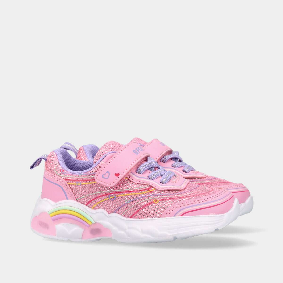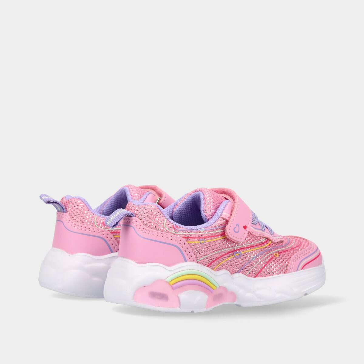 Sapatilha rosa com detalhes multicor para menina e sola com luz da Chicco. De velcro e cordão elástico, são confortáveis, leves e fáceis de calçar. Ideais para o dia a dia.