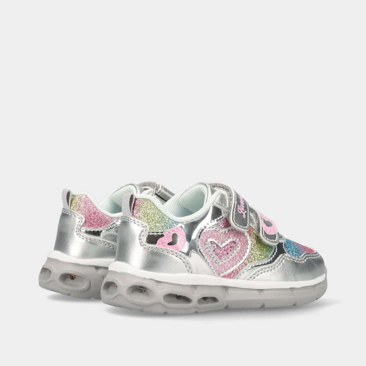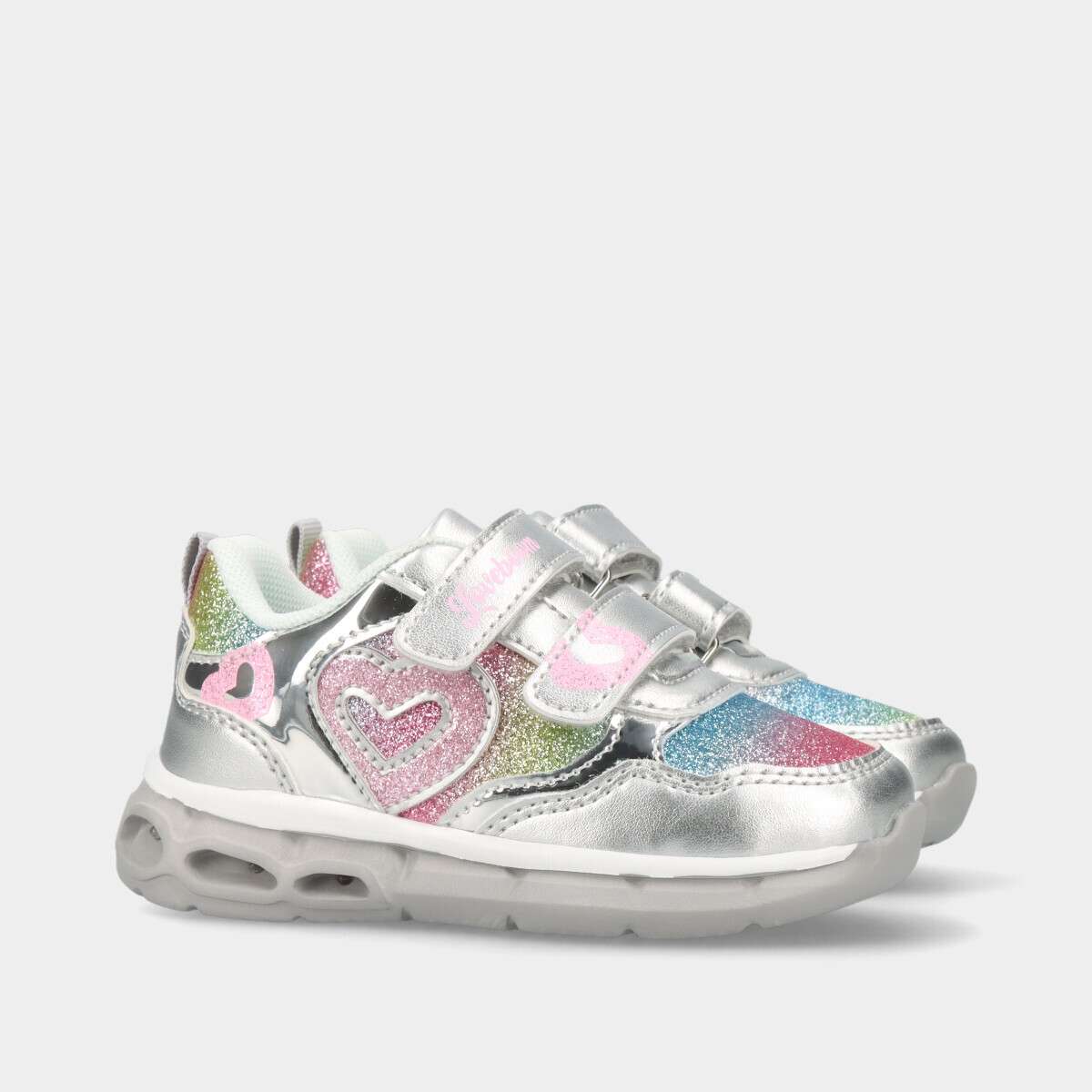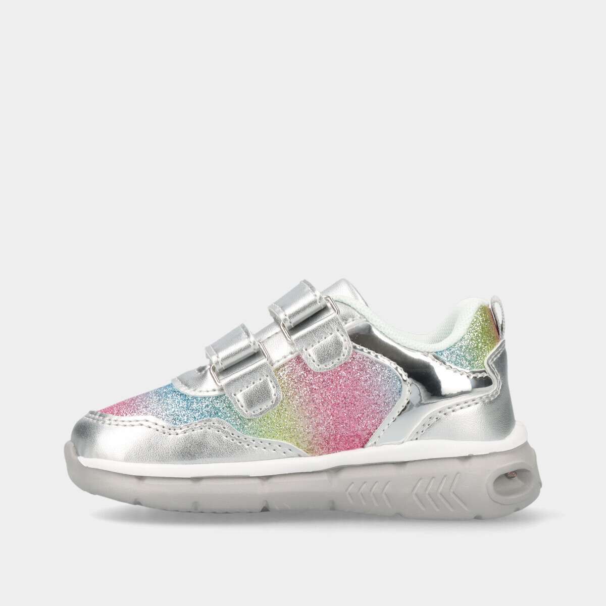 Ténis prateados multicoloridos repletos de brilho e sola com luz para menina da Chicco. Com fecho de velcro, são confortáveis, leves e fáceis de calçar. Ideais para o dia a dia.