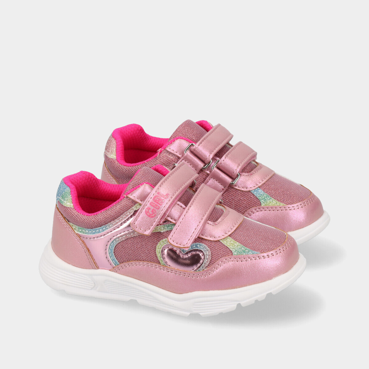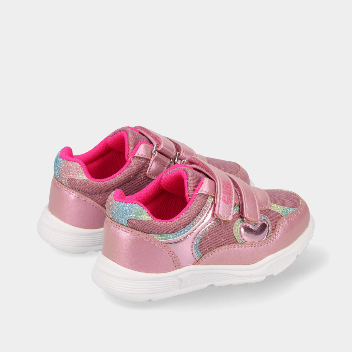 Ténis Chicco para menina em rosa, com brilho, pormenores multicoloridos e velcros, leves e confortáveis, ideais para a escola e fáceis de calçar no dia a dia.