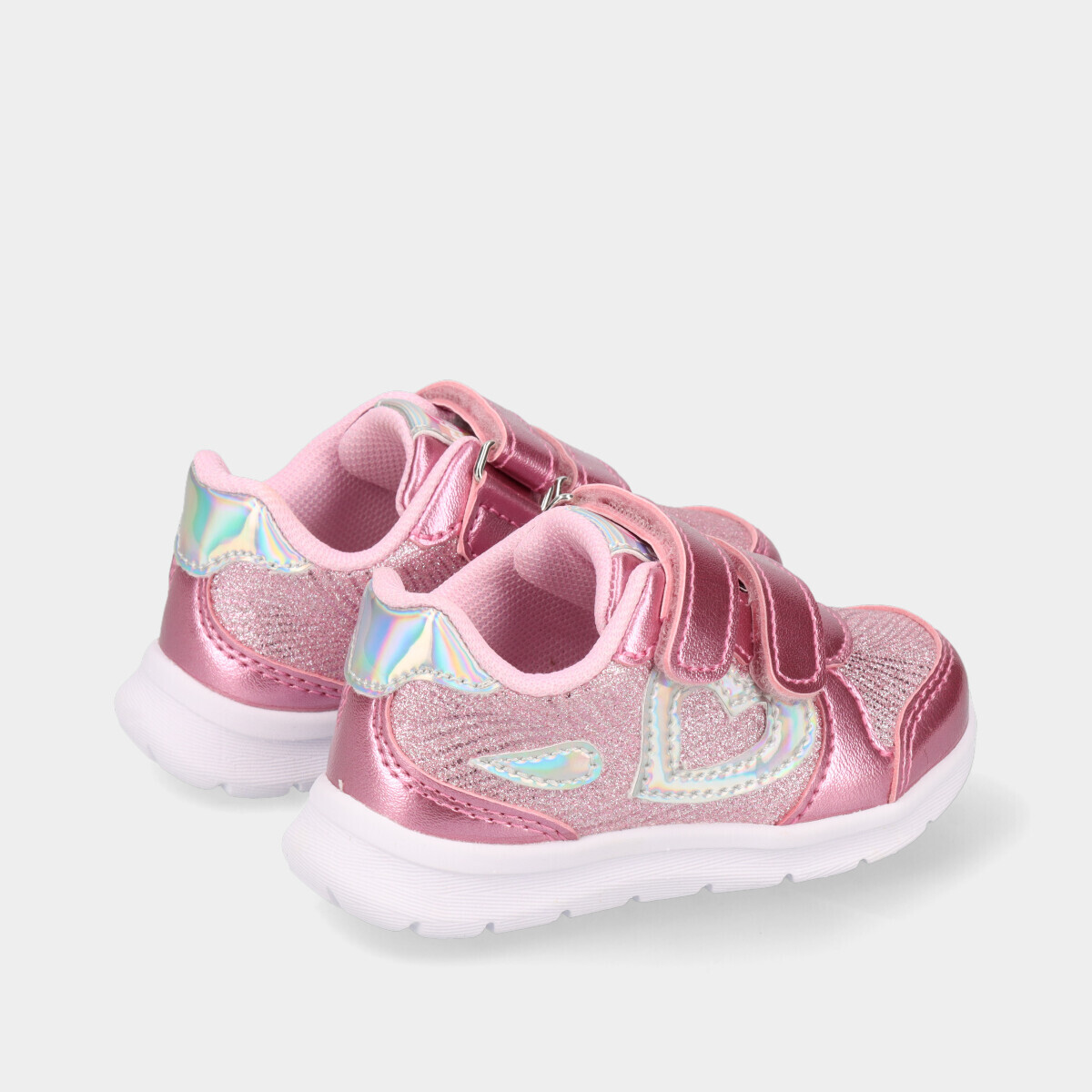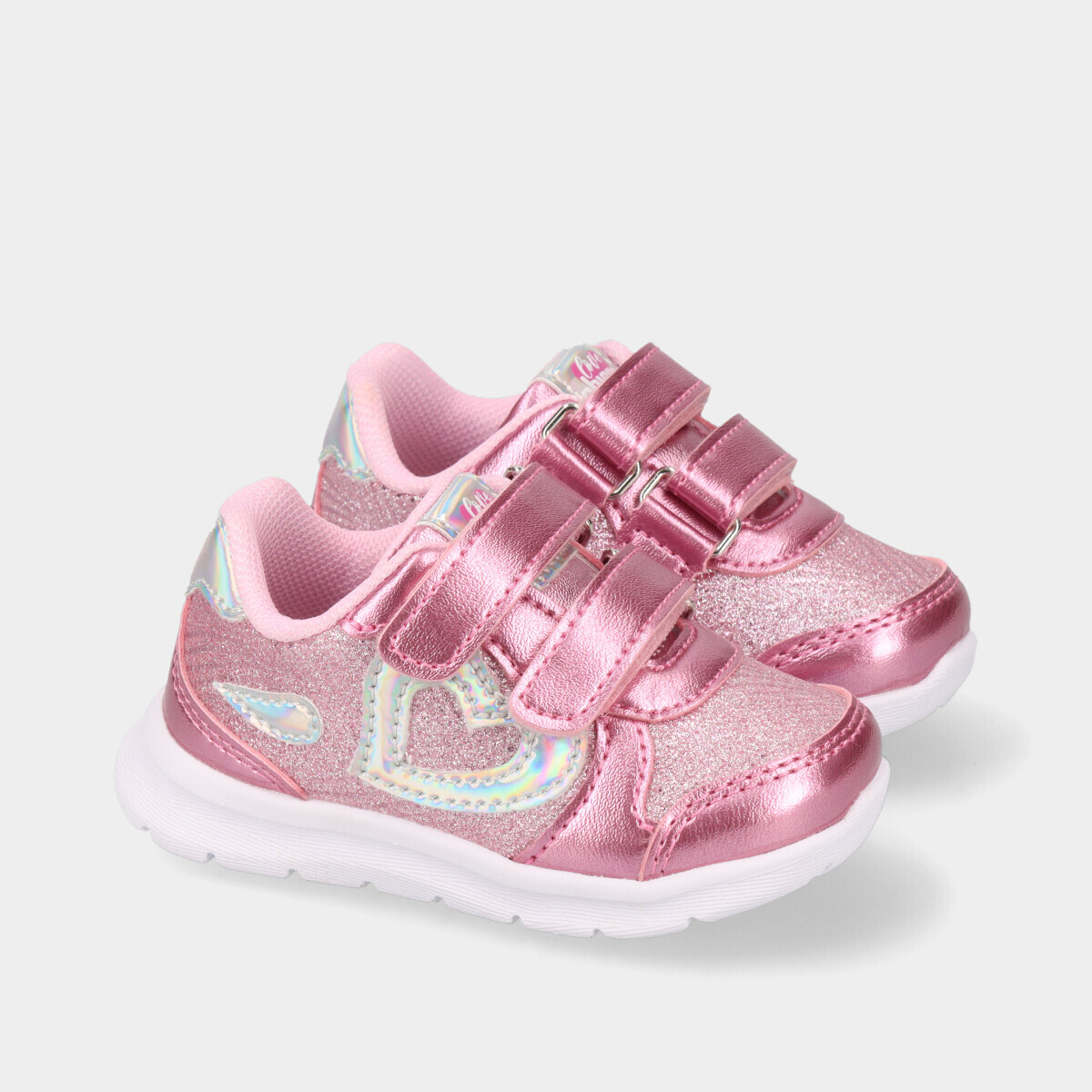 Ténis Chicco para menina em rosa, com brilho, pormenores holográficos e velcros, leves e confortáveis, ideais para a escola e fáceis de calçar no dia a dia.