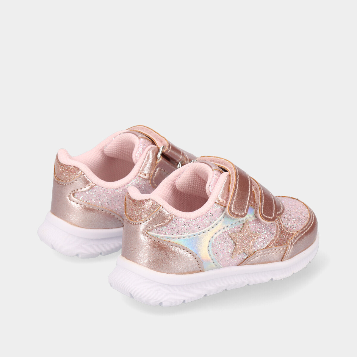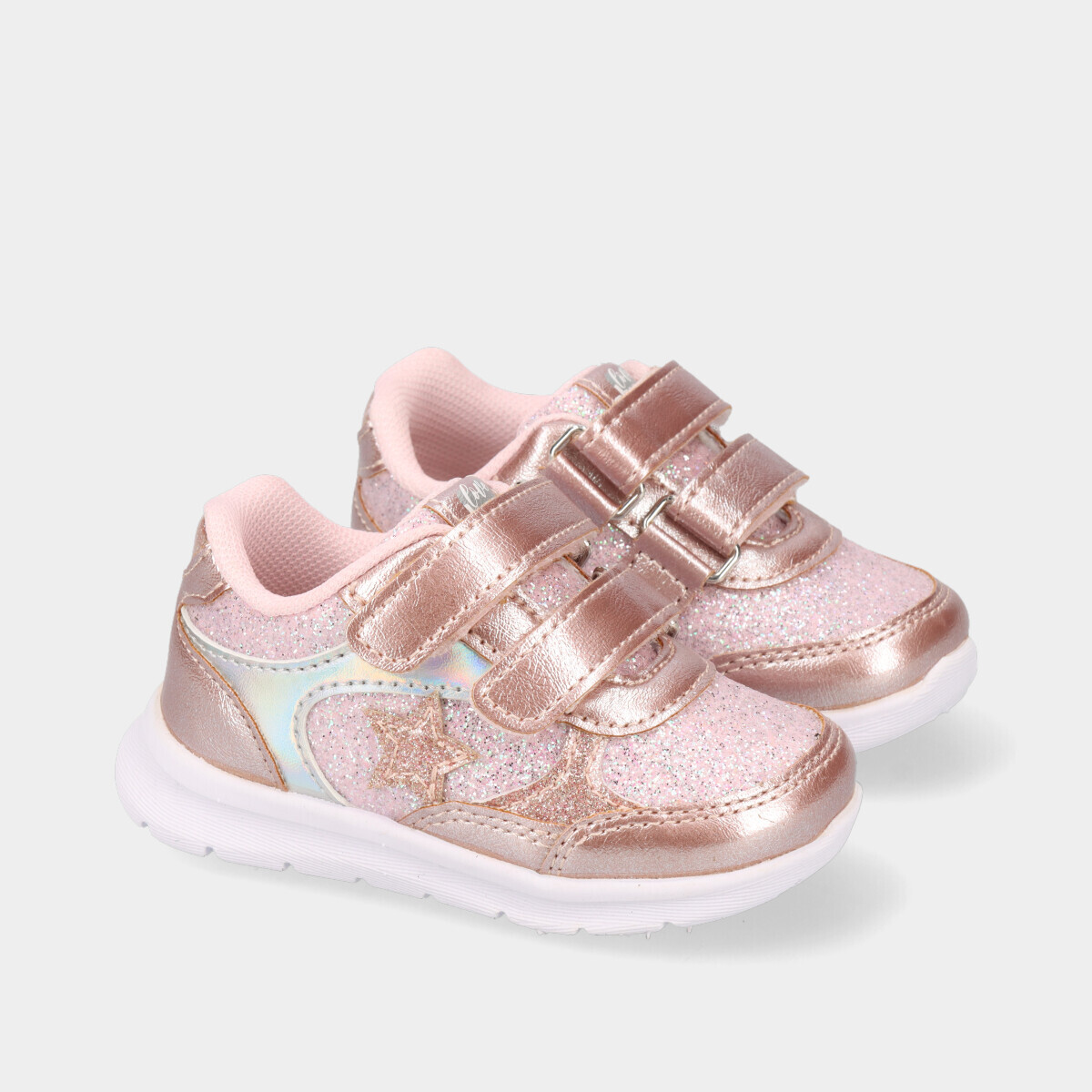 Ténis Chicco para menina em rosa, com brilho, pormenores holográficos e velcros, leves e confortáveis, ideais para a escola e fáceis de calçar no dia a dia.