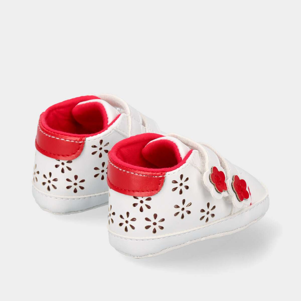 Tênis para bebé menina branco com vermelho e duas tiras de velcro no peito do pé.