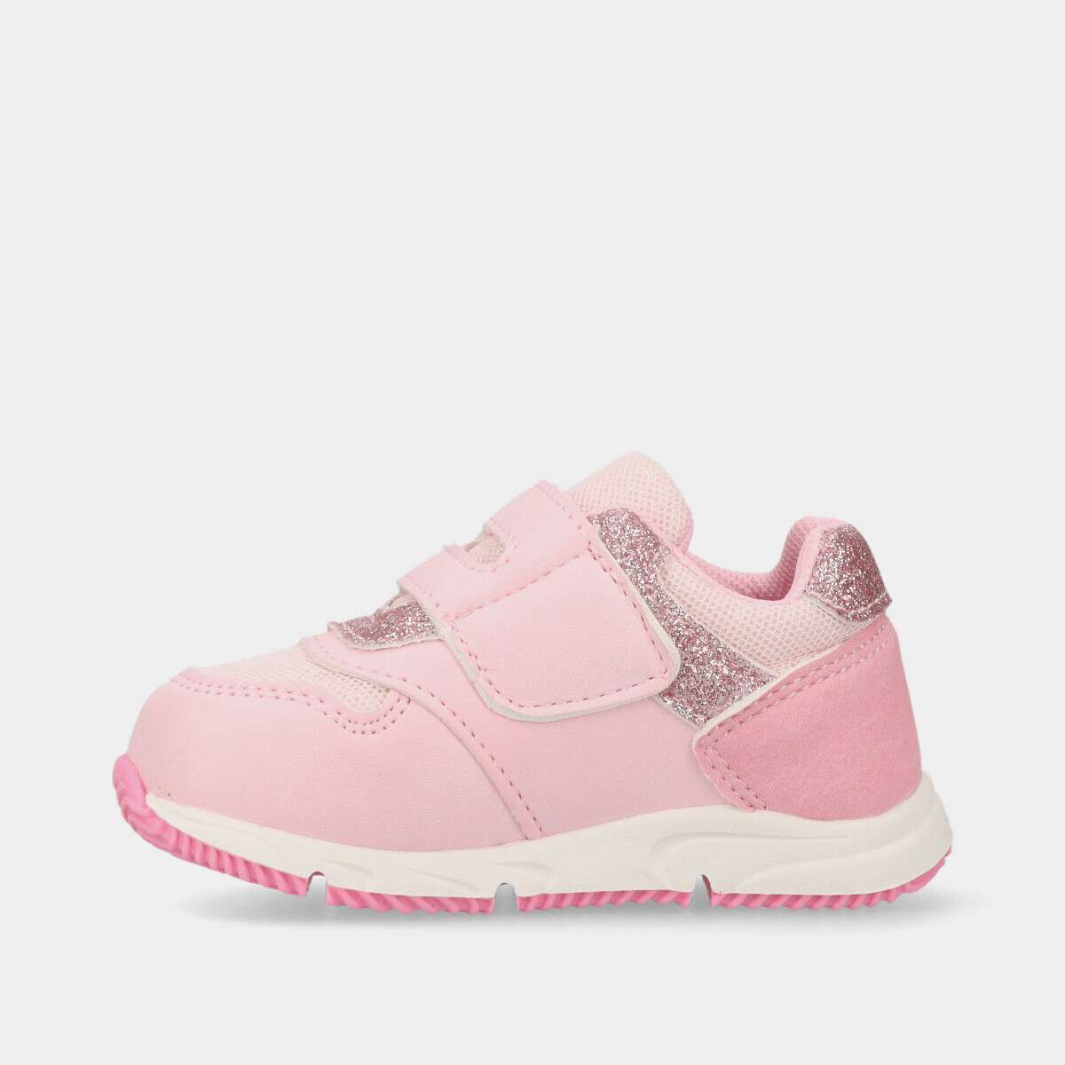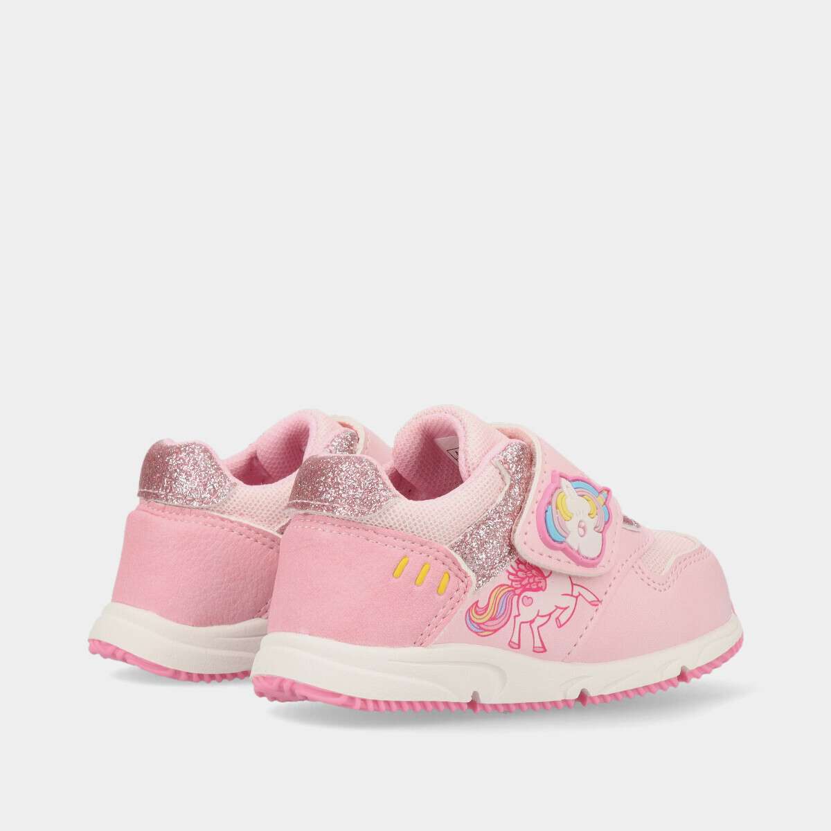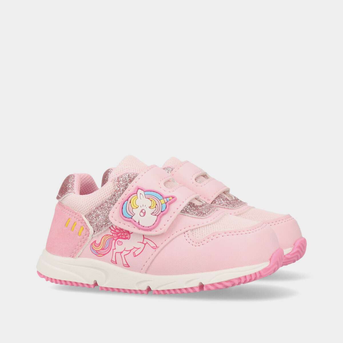 Ténis infantil na cor rosa com pormenores em glitter e tema de unicórnio.