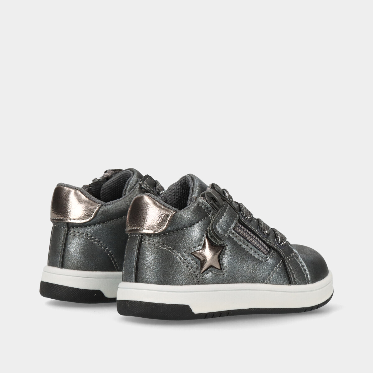 Ténis para menina em cinza, ideais para escola, passeios e atividades diárias, com cordão e velcro para calçar facilmente.