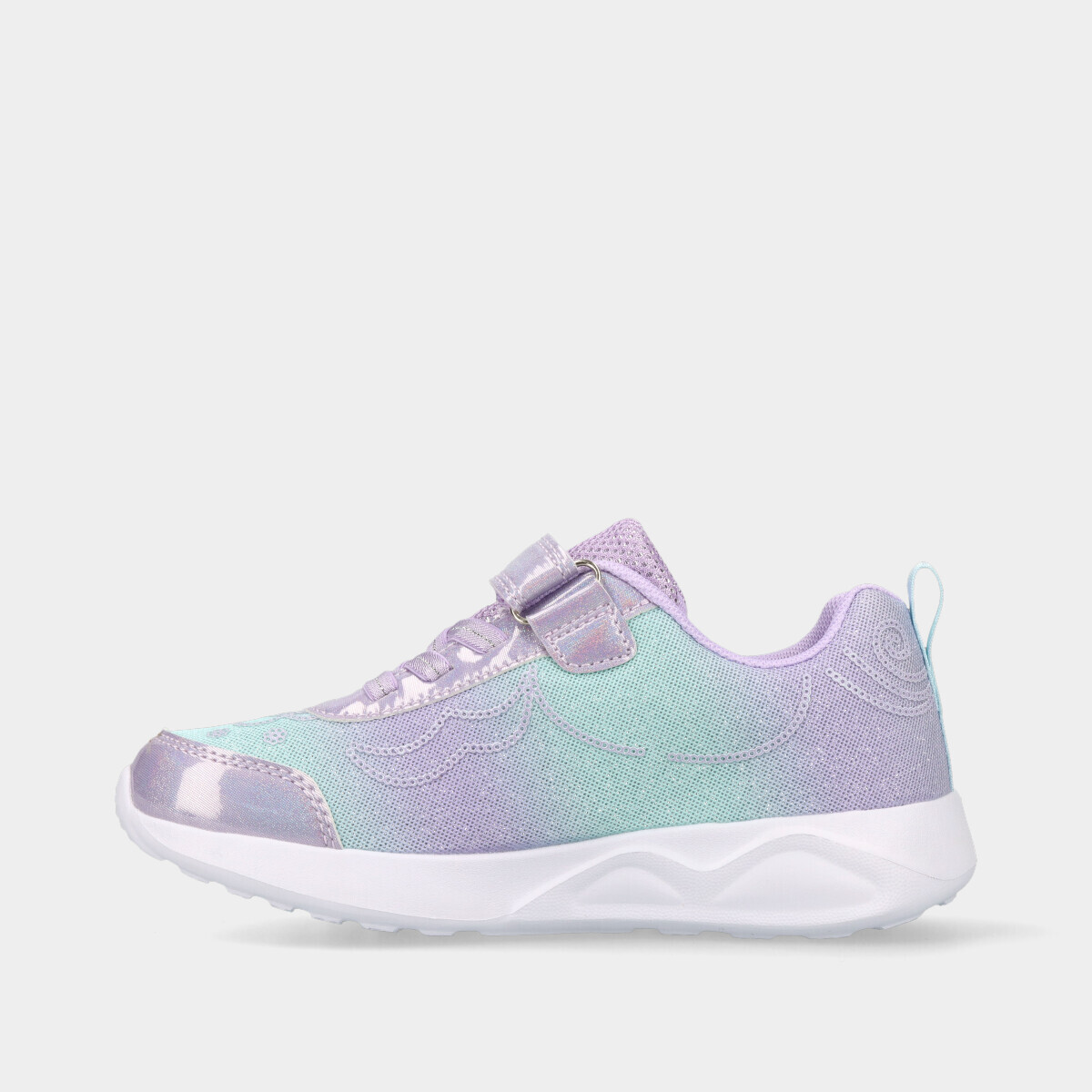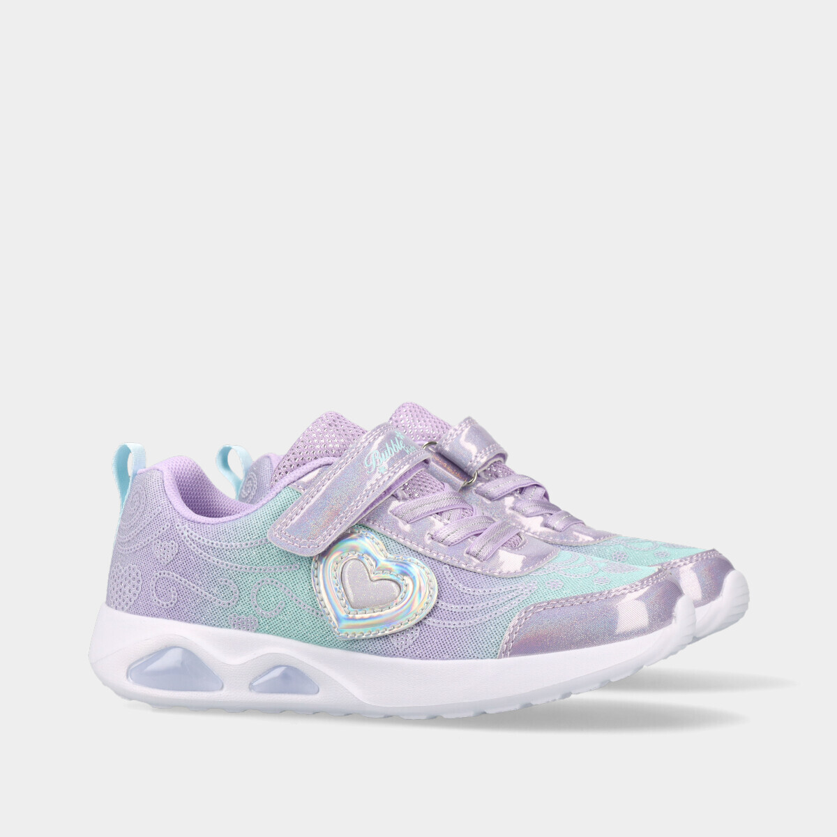 Ténis lilás para menina com luzes na sola. Com fecho em velcro e cordão elástico, são práticos, leves e fáceis de calçar. Ideais para o dia a dia.