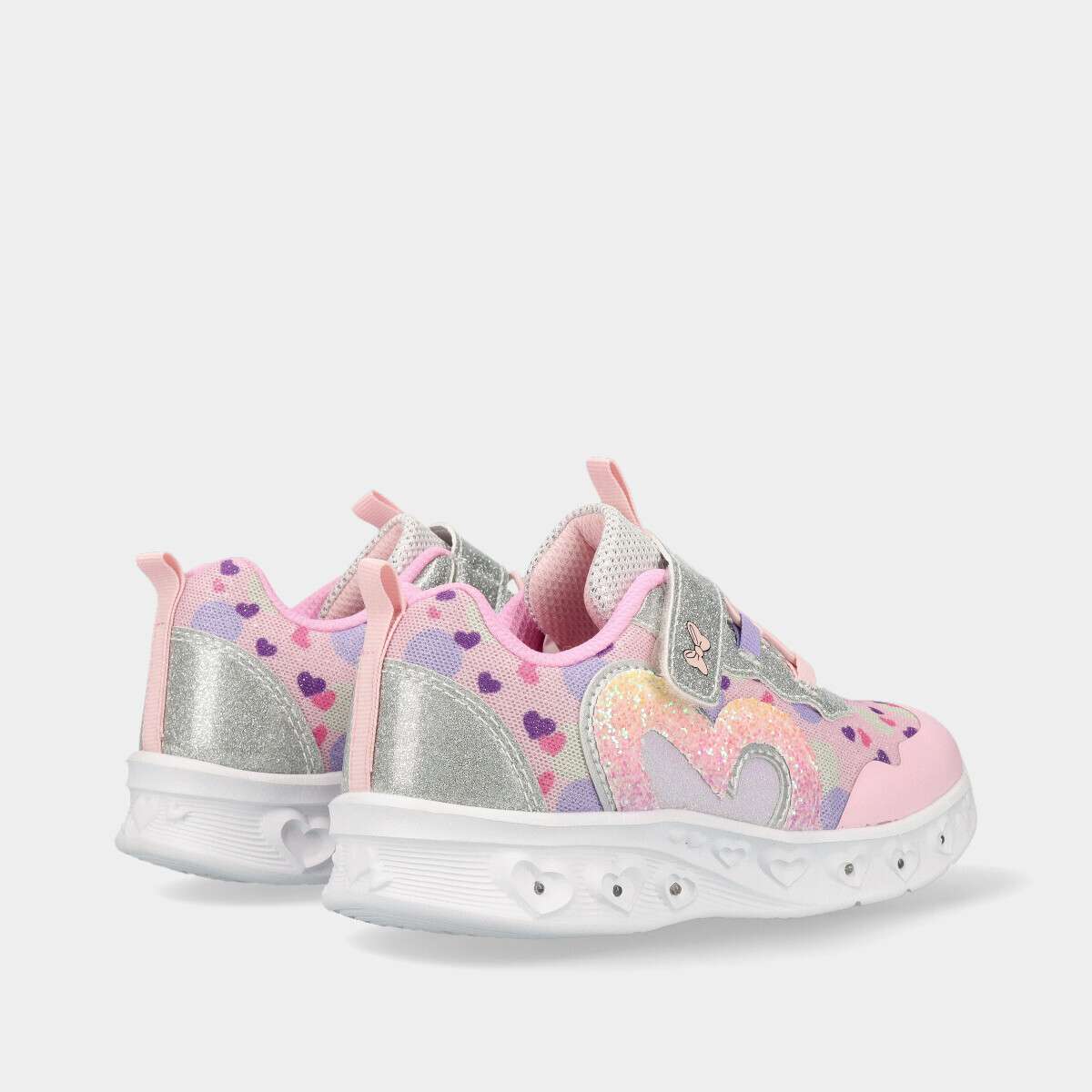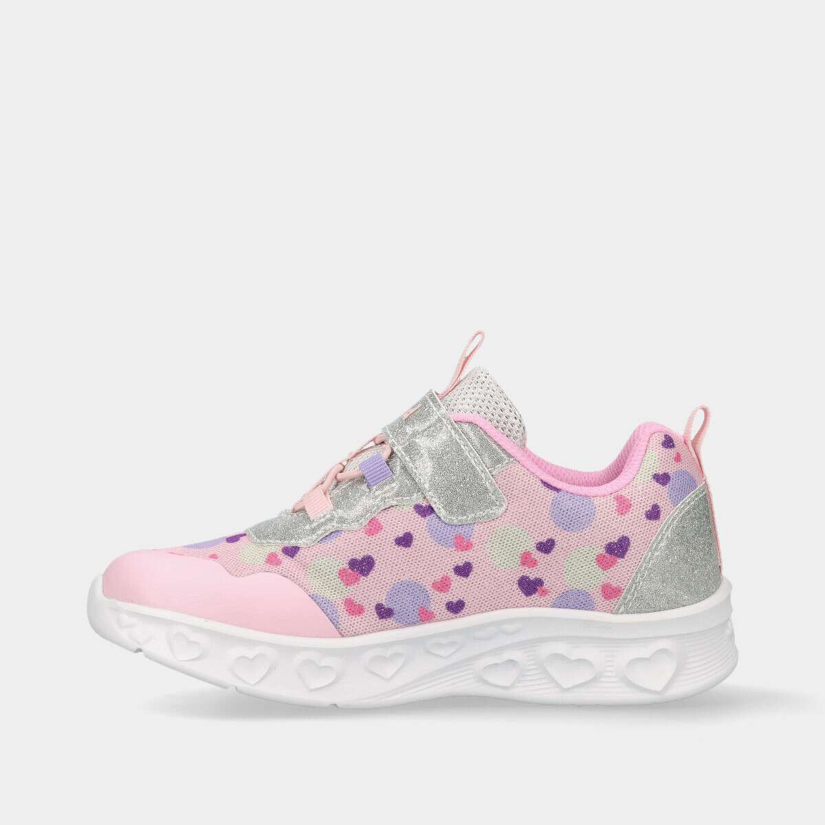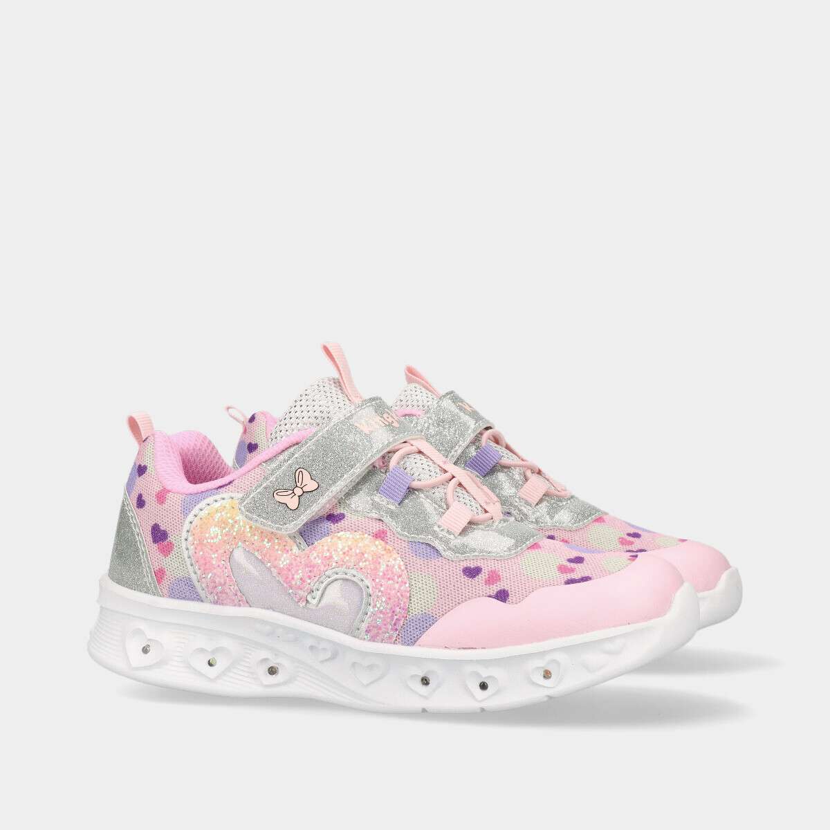 Tênis de menina na cor rosa e cinza com luz na sola, velcro e cordão elástico.