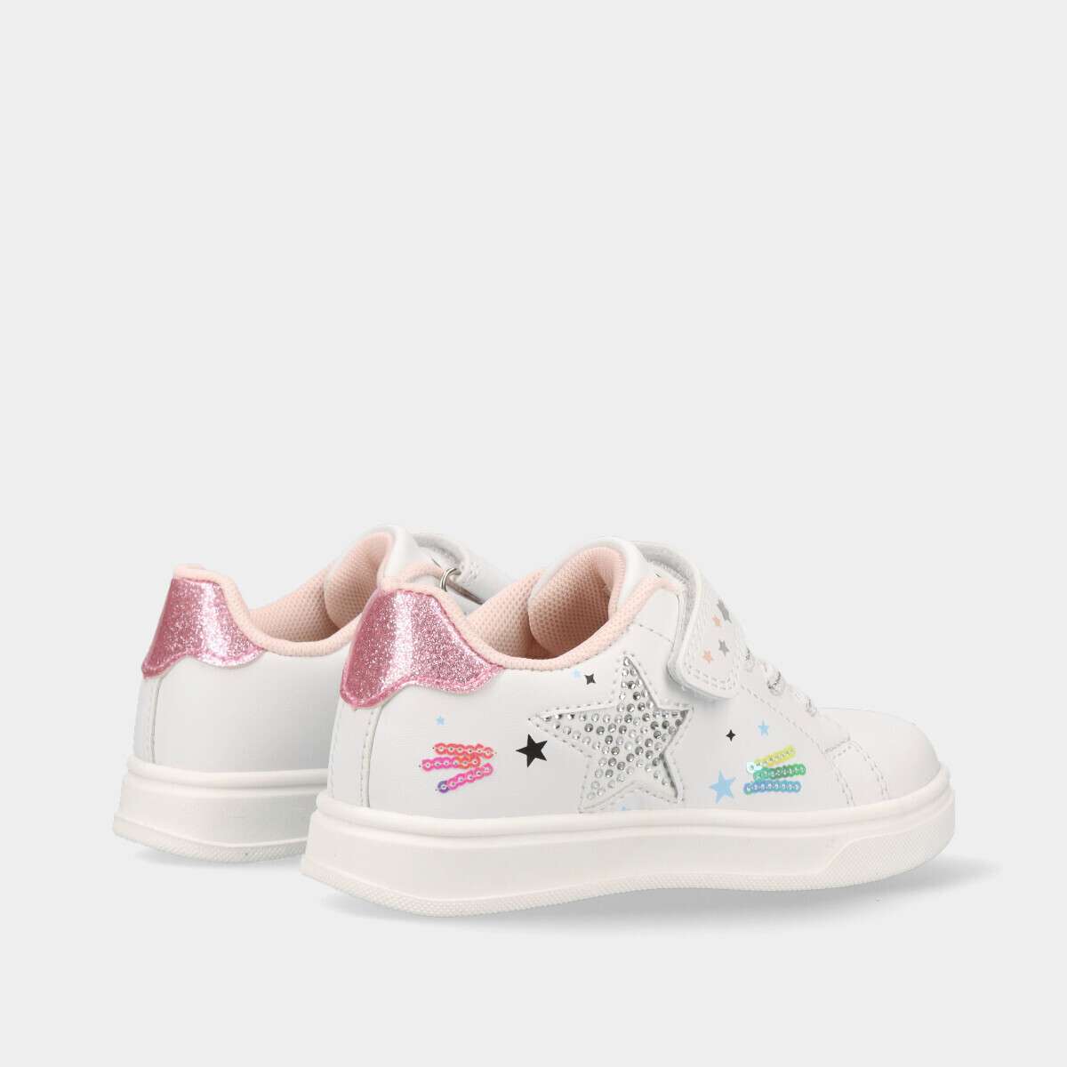 Tênis na cor branca com detalhes em rosa e brilhantes, de velcro e cordão elástico.