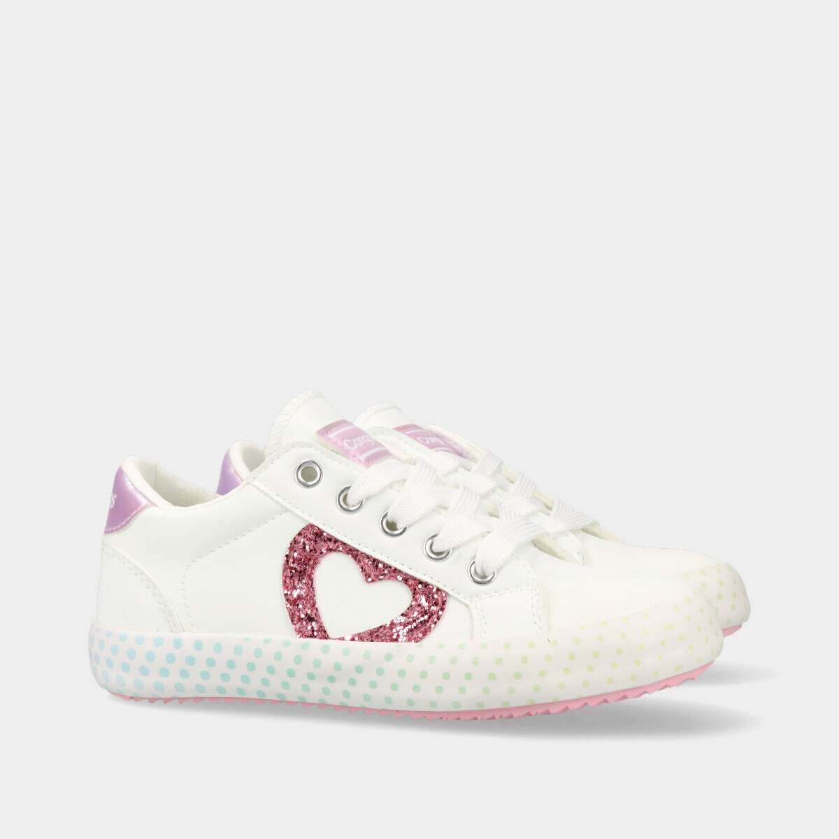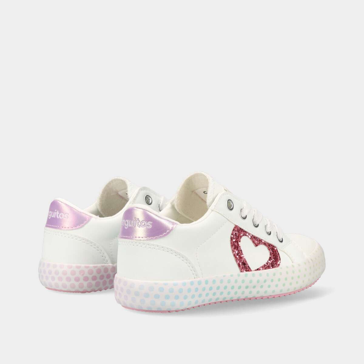 Ténis brancos que combinam conforto, durabilidade e estilo. Com um design elegante, coração em glitter rosa e sola com bolinhas pastel, são ideais para o dia a dia. O fecho de cordões garante um ajuste seguro, tornando-os perfeitos para qualquer ocasião.