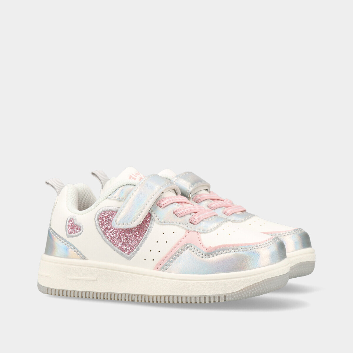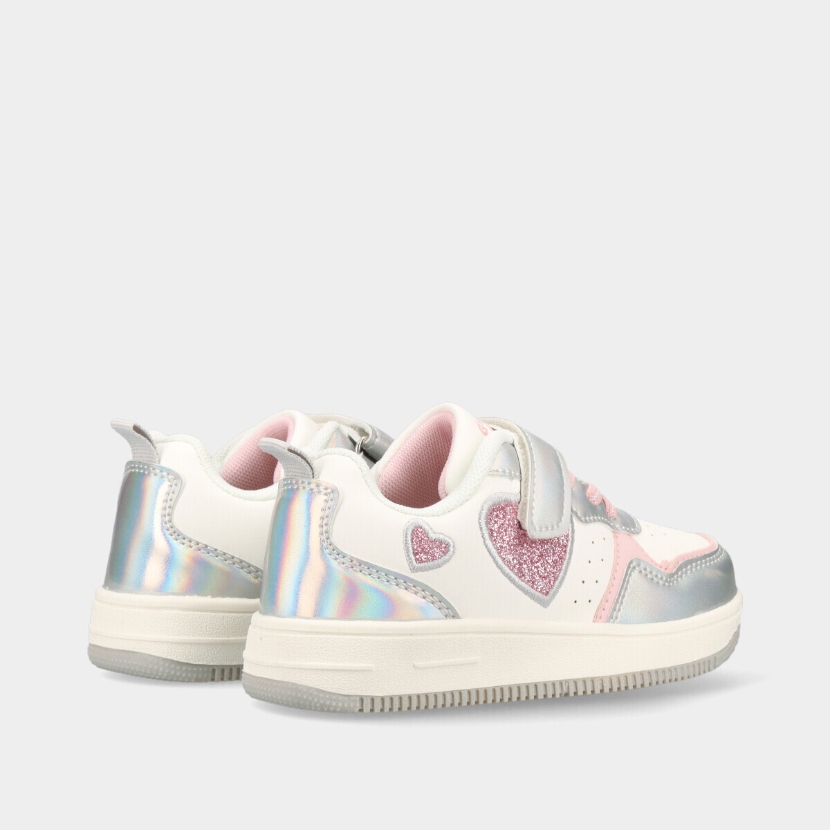 Ténis para menina em branco com pormenores iridescentes e brilhantes, ideais para escola, passeios e atividades diárias, com velcro e atacador elástico para calçar facilmente.