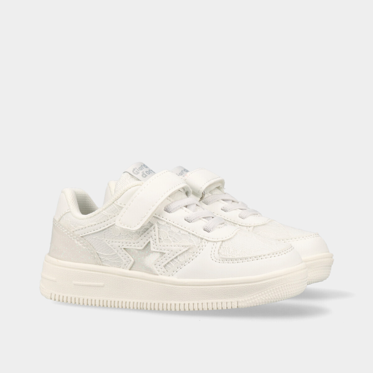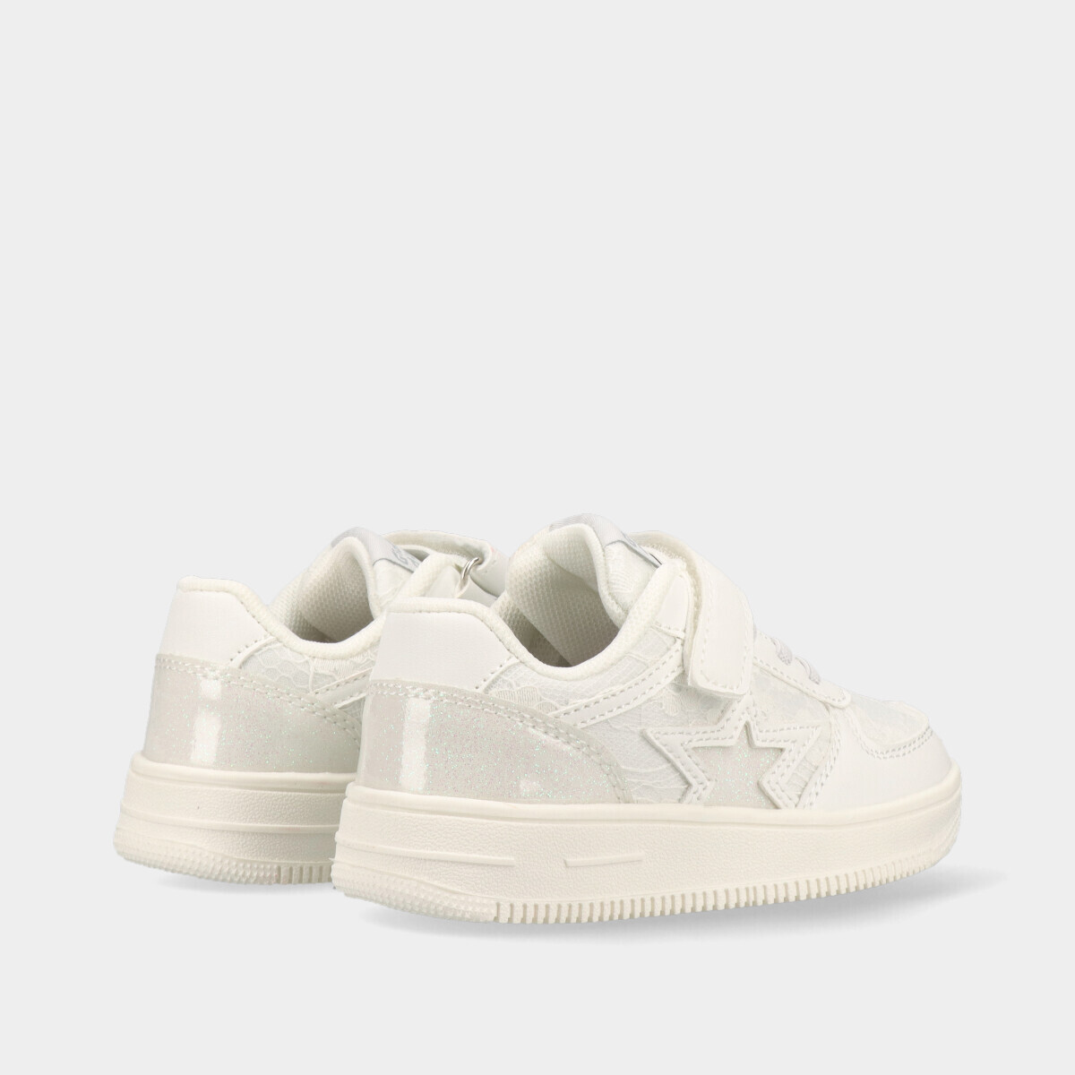 Ténis para menina em branco com pormenores de brilho e renda, ideais para escola, passeios e atividades diárias, com velcro e atacador elástico para calçar facilmente.