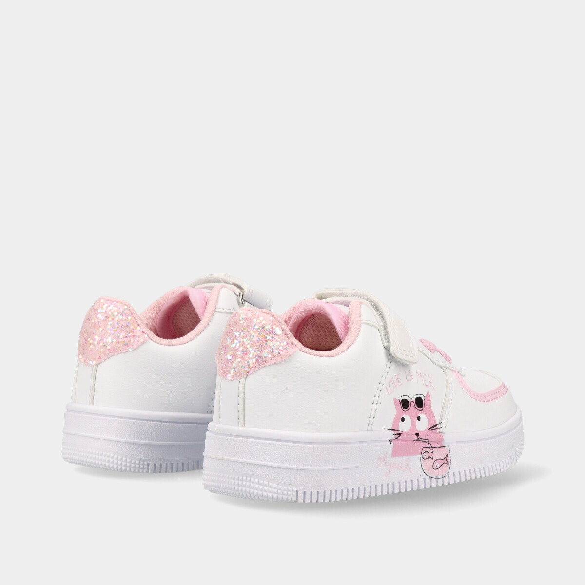 Ténis para menina em branco com pormenores em rosa, ideais para escola, passeios e atividades diárias, com velcro e atacador elástico para calçar facilmente.