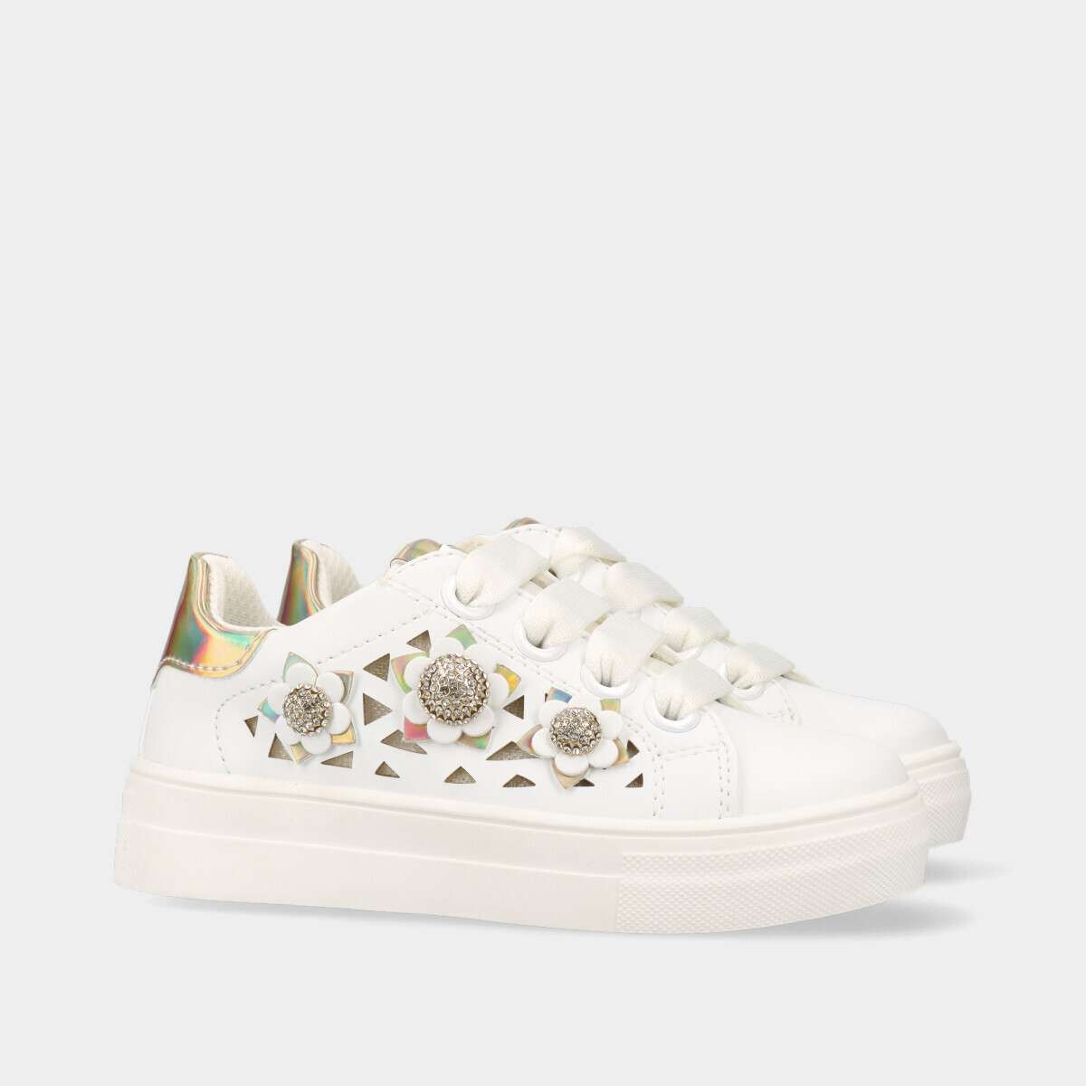 Ténis brancos com pormenores holográficos e aplicações na lateral para menina, de cordão e fecho lateral.