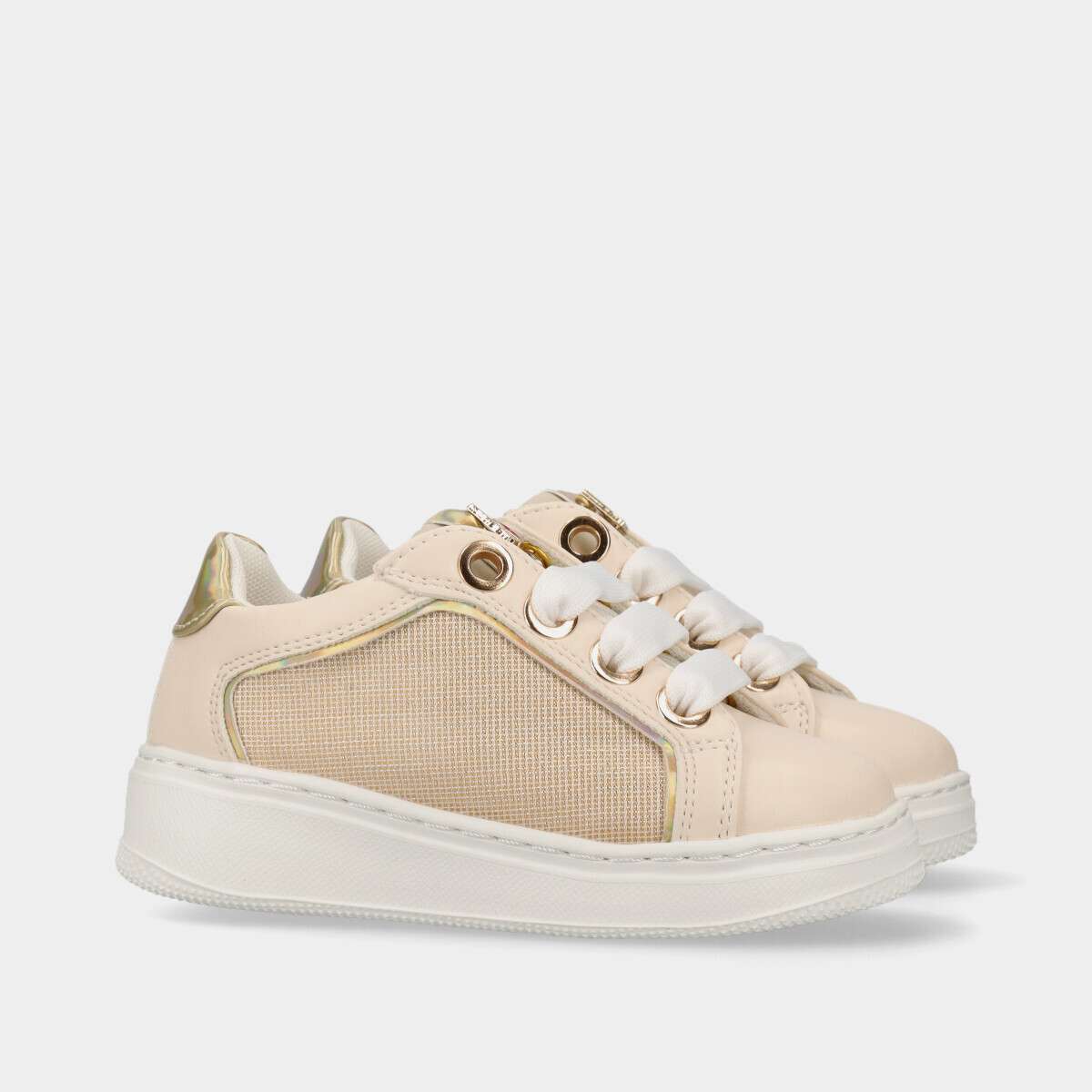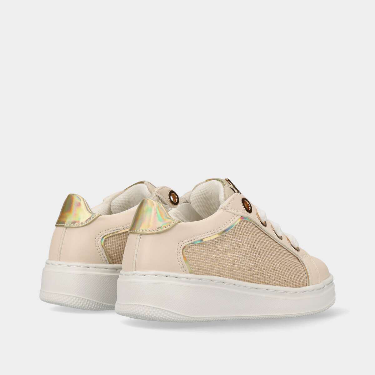 Ténis bege com pormenores holográficos dourados para menina, com cordão e fecho lateral.