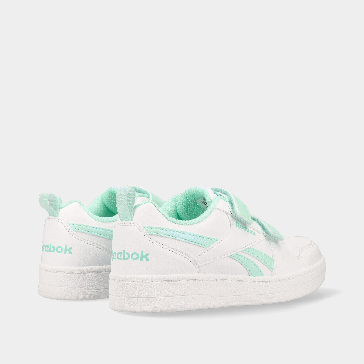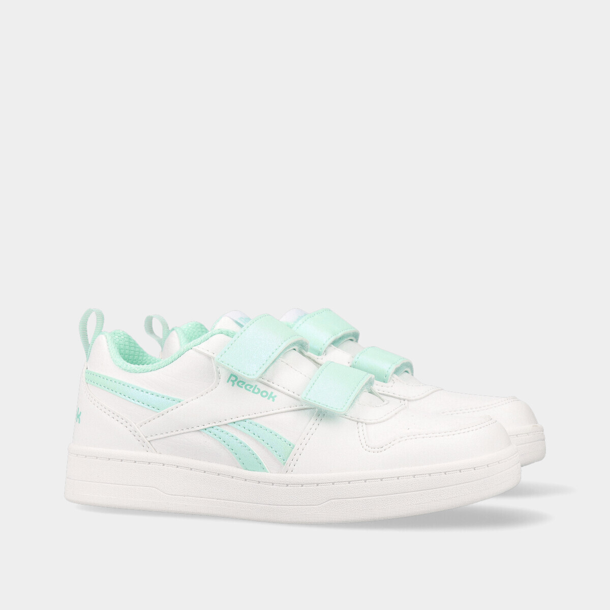 Ténis Reebok Royal Prime 2.0 Two Strap Hook & Loop para menina, em branco, com pormenores em verde-água e brilho. Dois velcros práticos, ideais para o dia a dia.