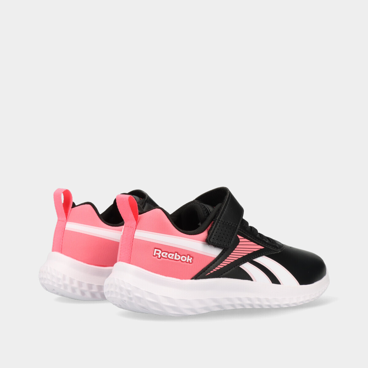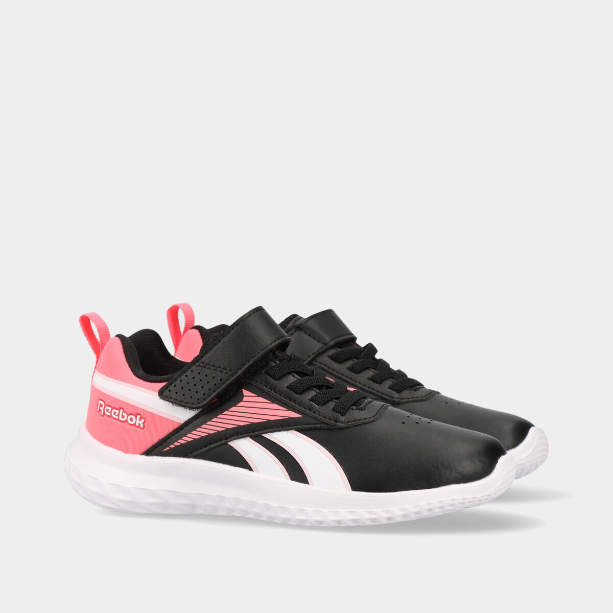 Ténis Reebok Rush Runner Syn em preto e pormenores em contraste, com atacadores elásticos e velcro, ideais para uso diário e atividades desportivas. Confortáveis, leves e versáteis, oferecem desempenho fiável em qualquer ocasião.
