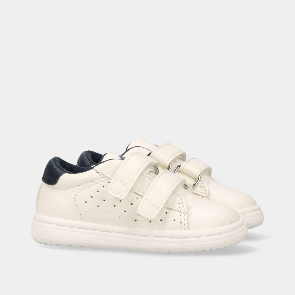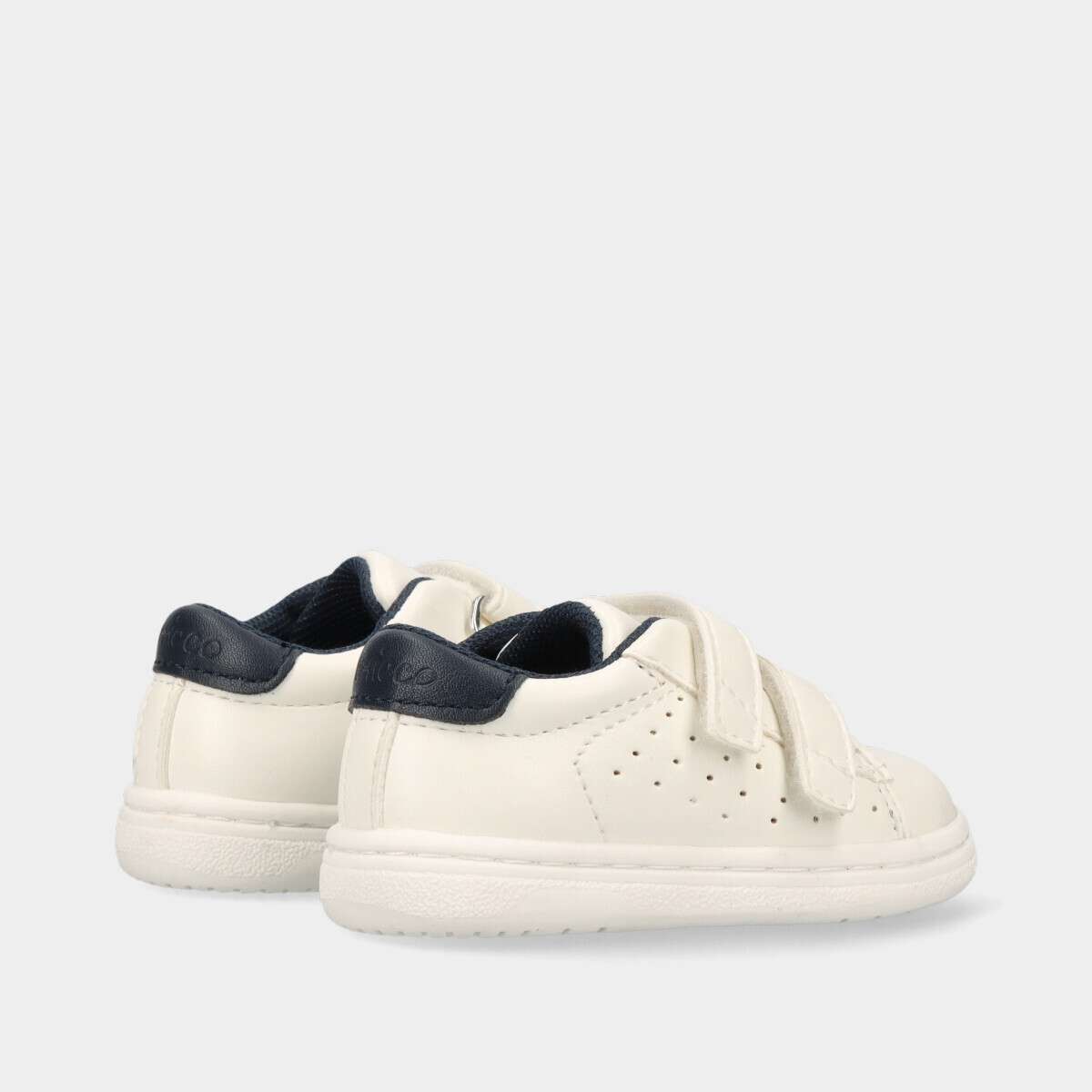 Ténis brancos com detalhe azul para bebé menino da Chicco. Com fecho de velcro, são confortáveis, leves e fáceis de calçar. Ideais para o dia a dia.