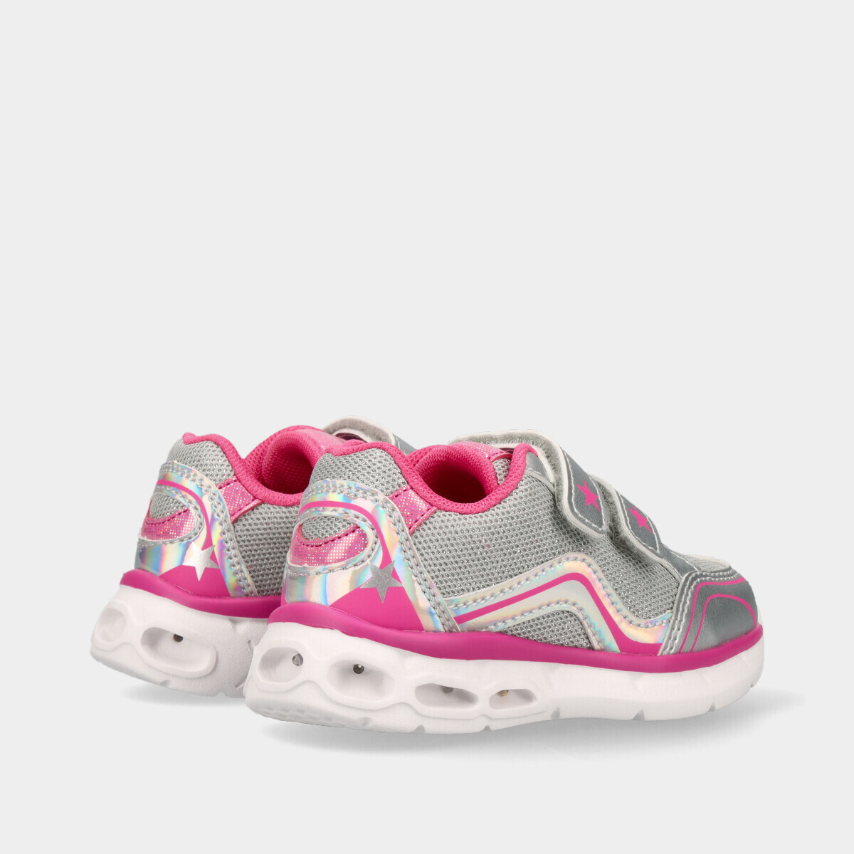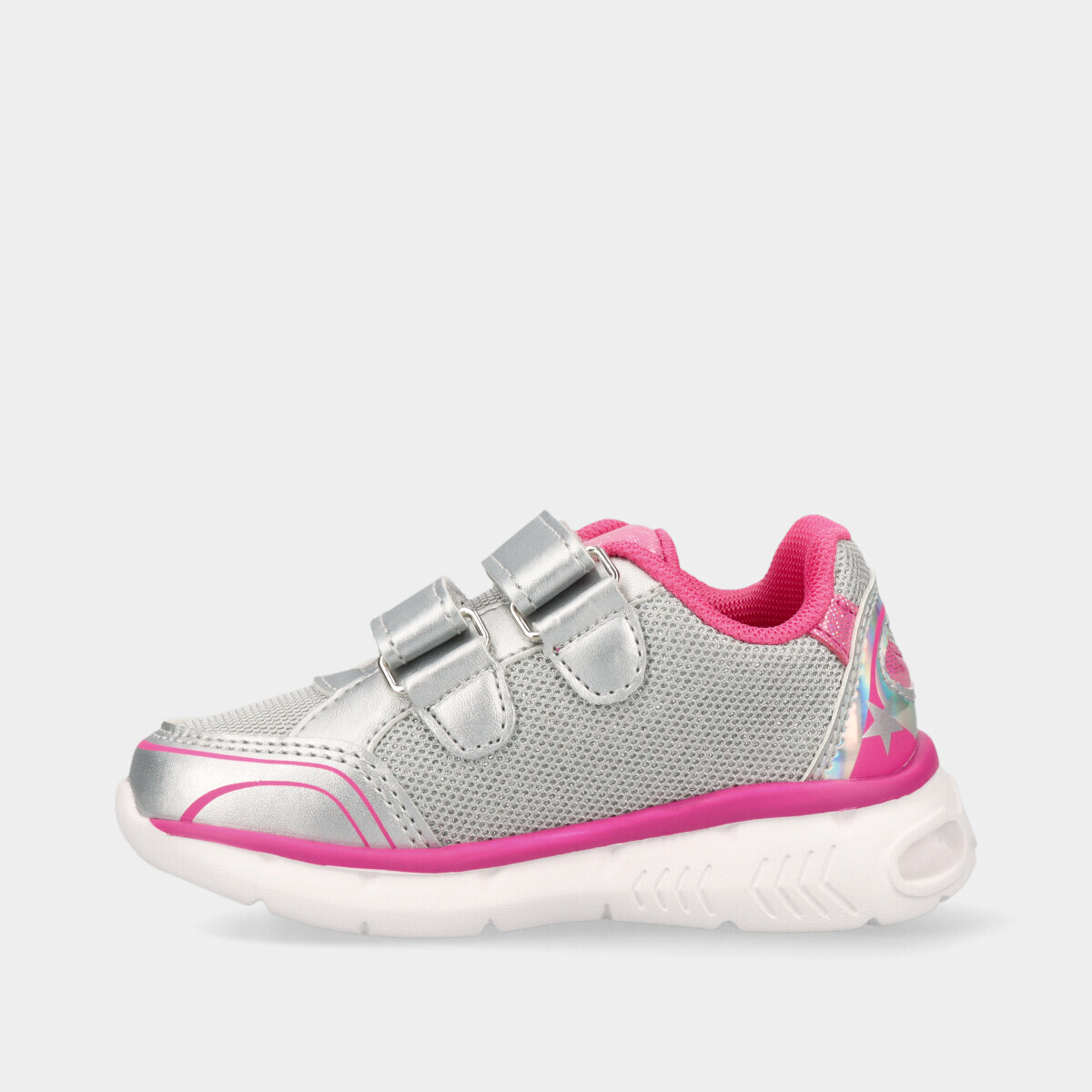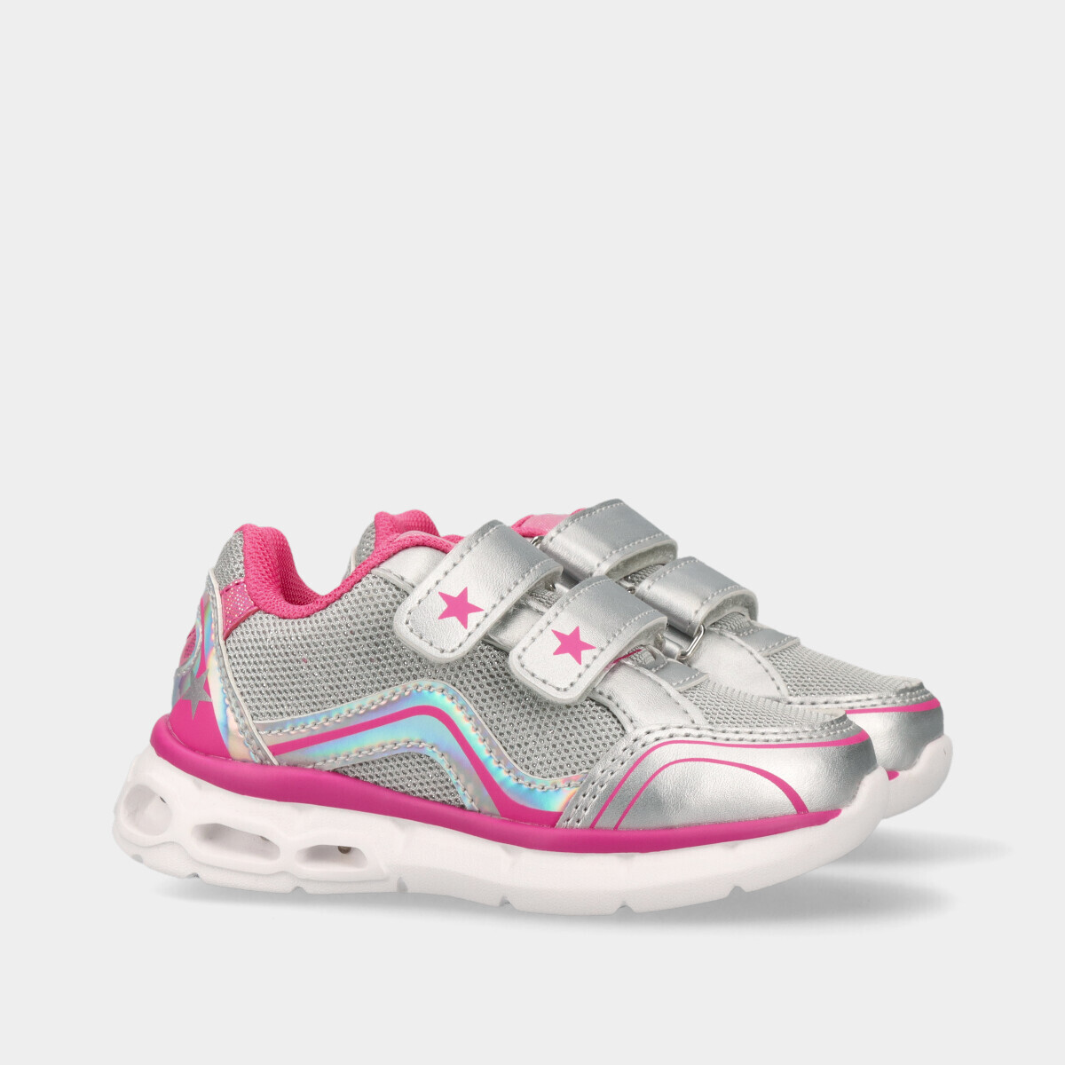 Ténis Chicco para menina em prateado com rosa e luzes coloridas que se acendem ao caminhar. Leves e confortáveis, ideais para a escola e fáceis de calçar no dia a dia.