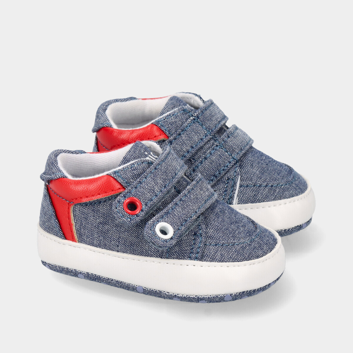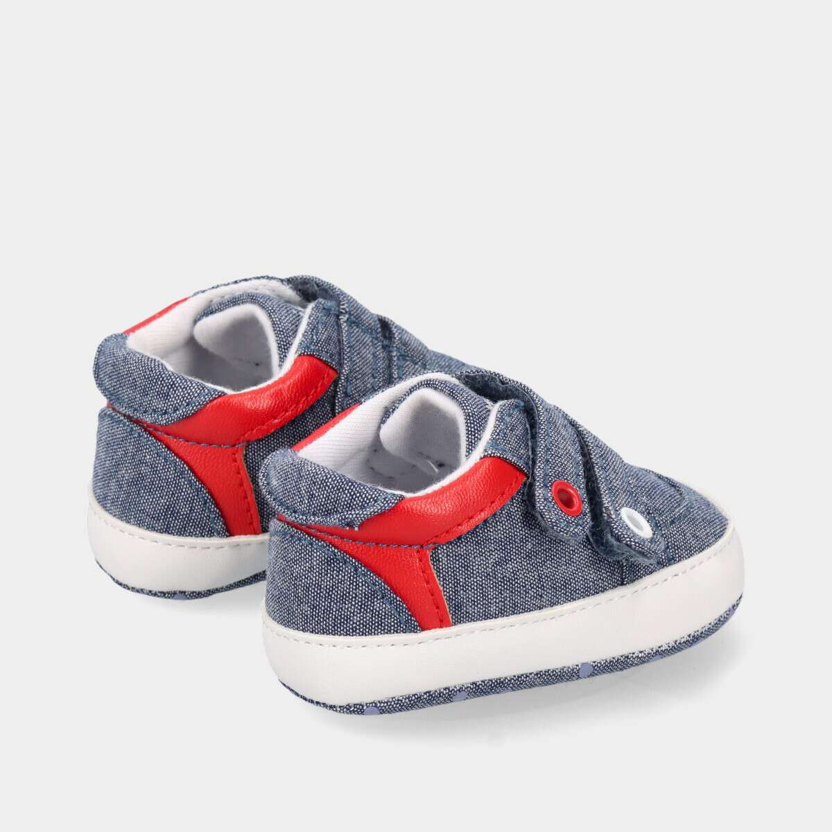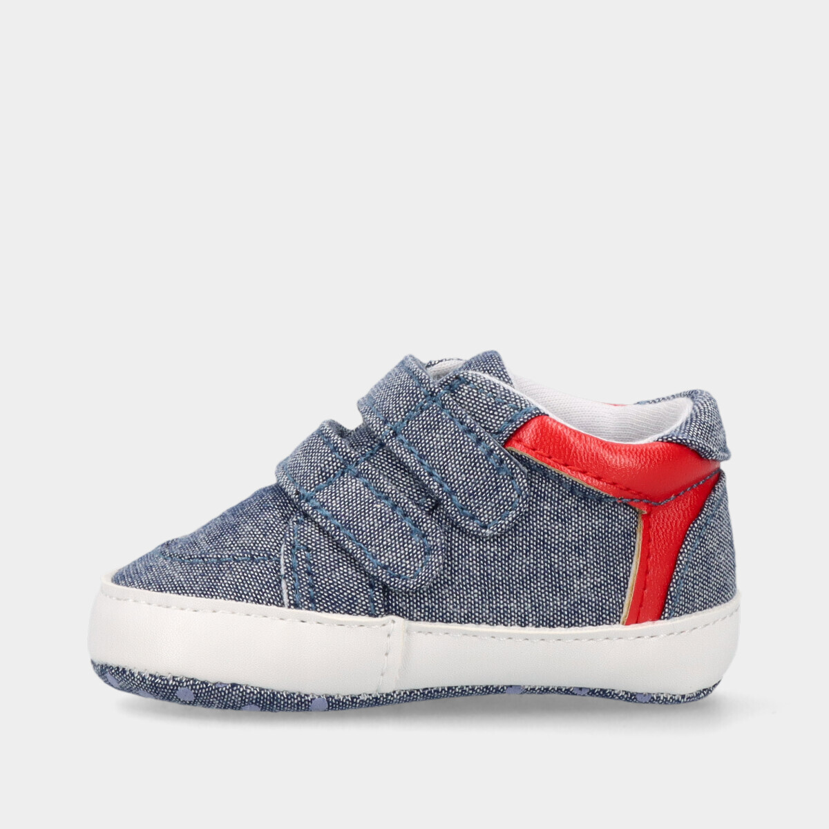 Tênis para bebé menino azul jeans com vermelho e branco, de duas tiras de velcro no peito do pé.