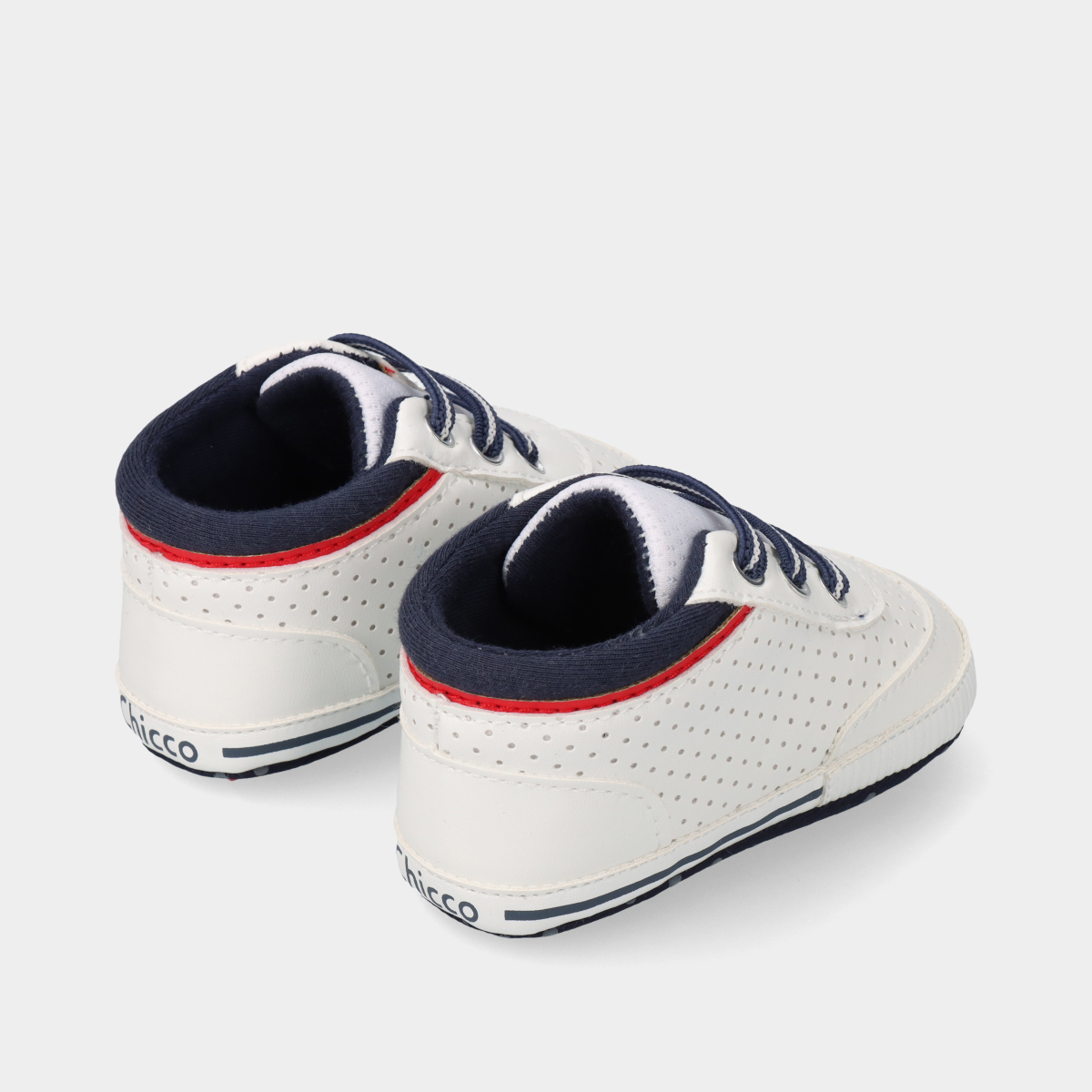 As sapatilhas Chicco Ollino na cor branca, com detalhes em azul e vermelho, são uma escolha encantadora para bebés!